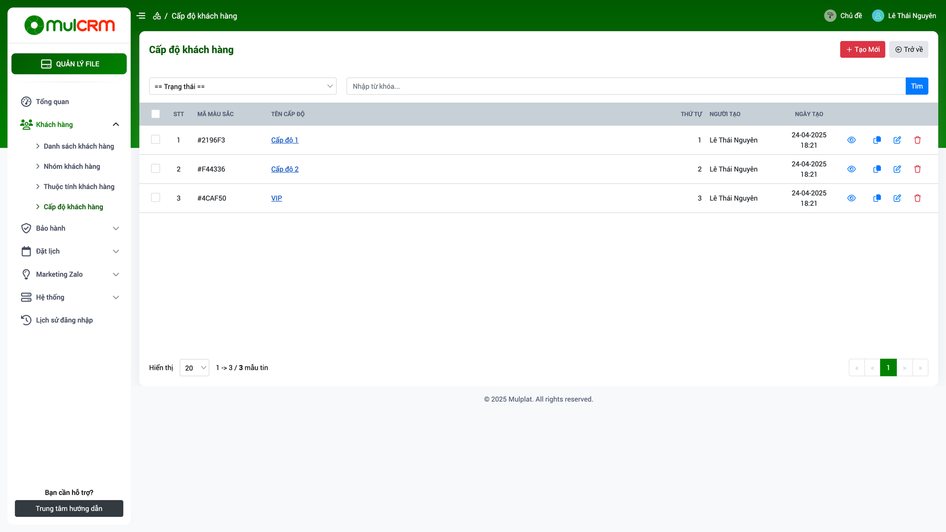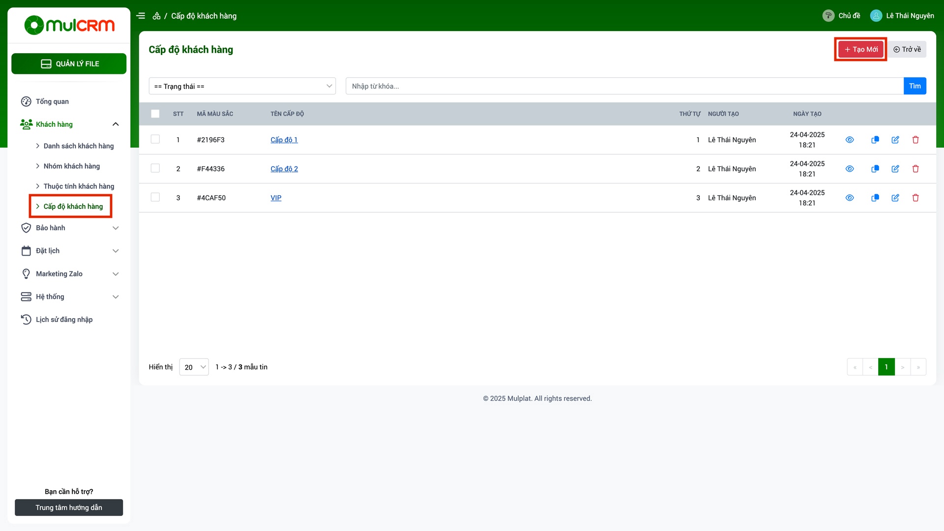 - Ẩn/Hiện: Thay đổi trạng thái ẩn hiện của Cấp độ khách hàng trên hệ thống.