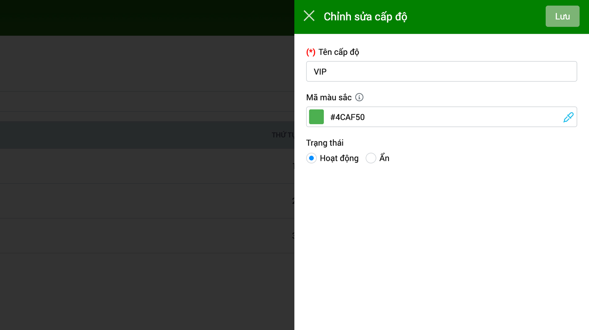 - Bước 2: Nhập Tên cấp độ, Mã màu sắc hoặc thay đổi Trạng thái theo nhu cầu.