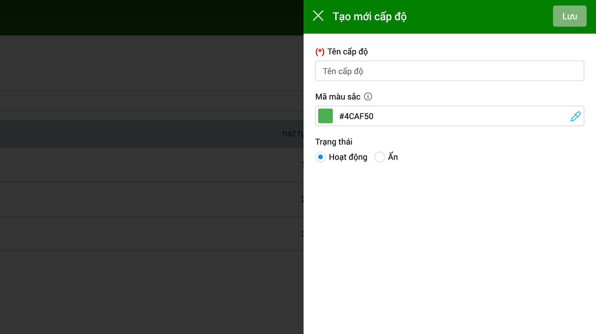 - Bước 2: Nhập Tên cấp độ, Mã màu sắc và thay đổi Trạng thái theo nhu cầu.