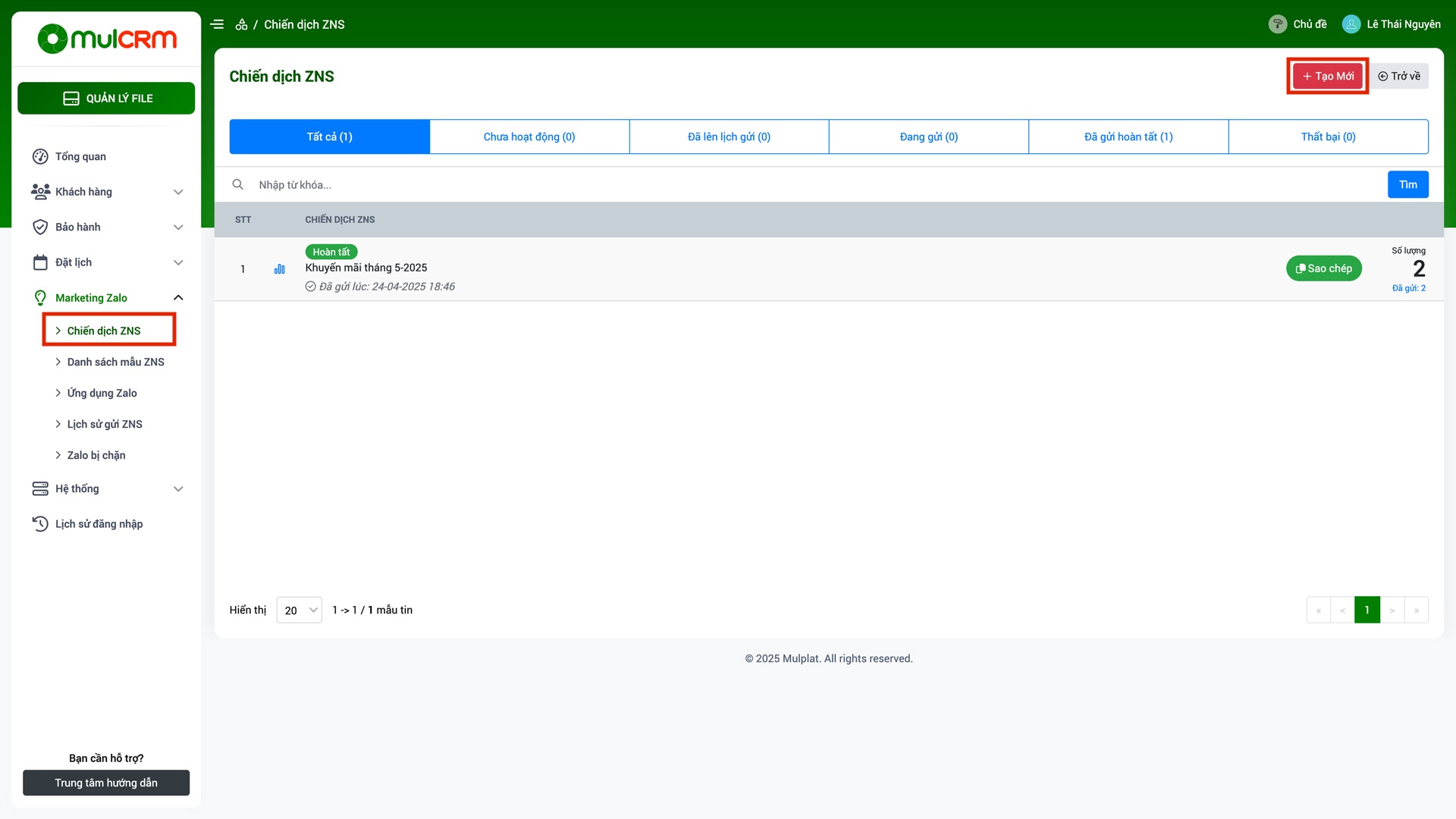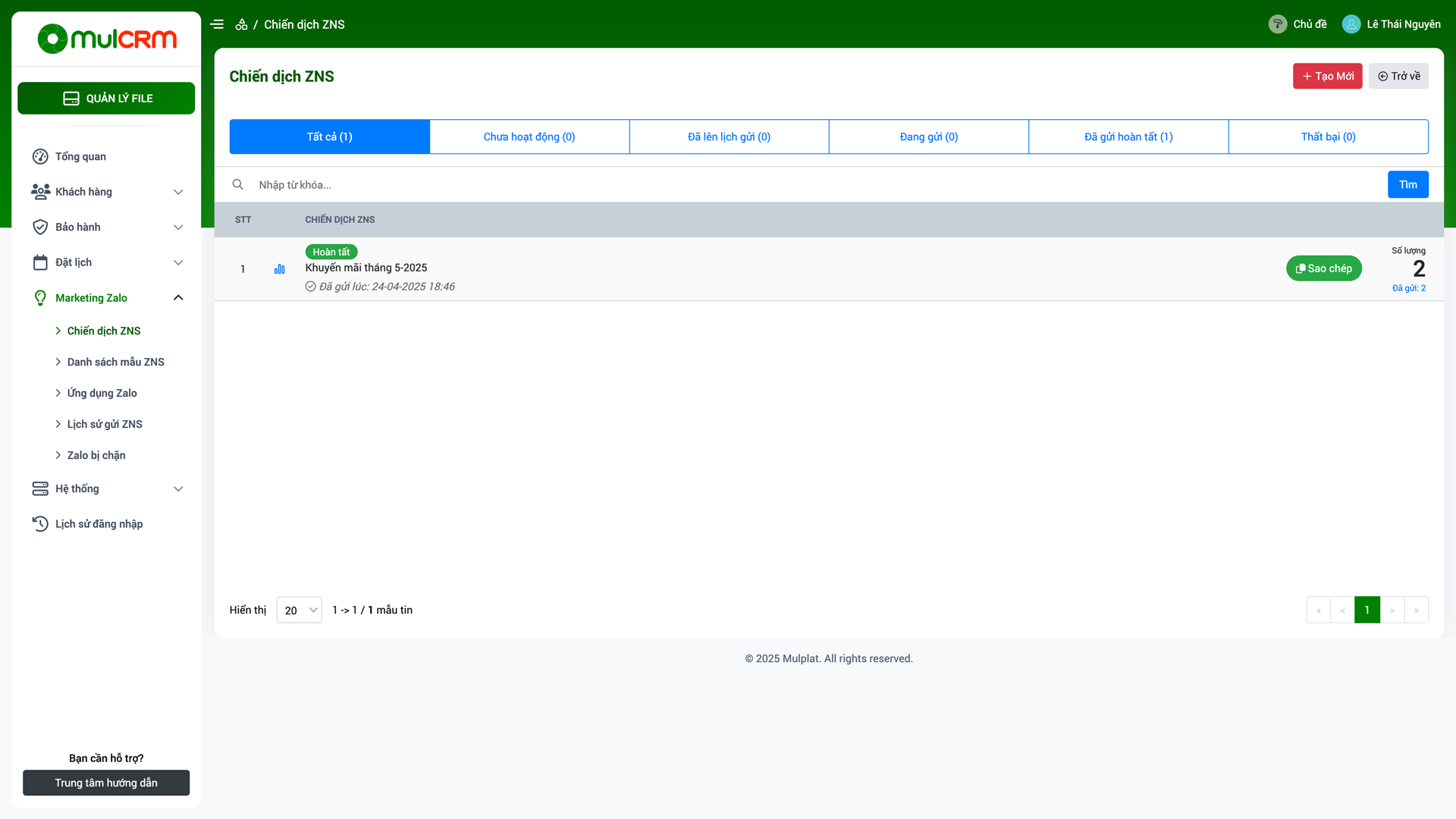 - Đã gửi hoàn tất: Hiển thị danh sách chiến dịch đã gửi xong.