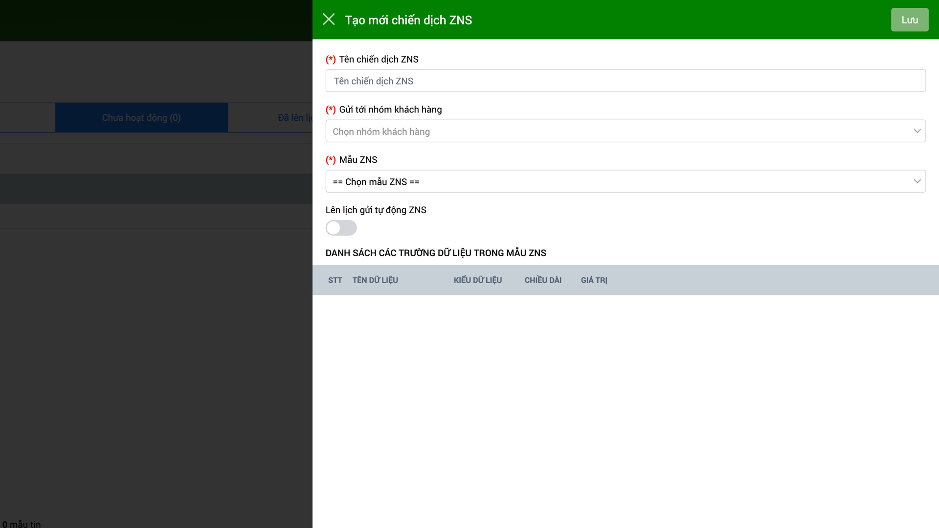 - Mẫu ZNS: Chọn 1 mẫu ZNS bạn đã tạo trước đó.