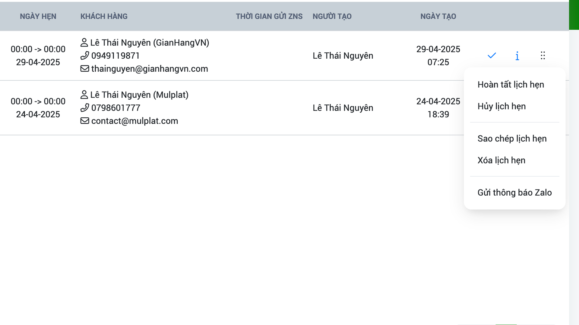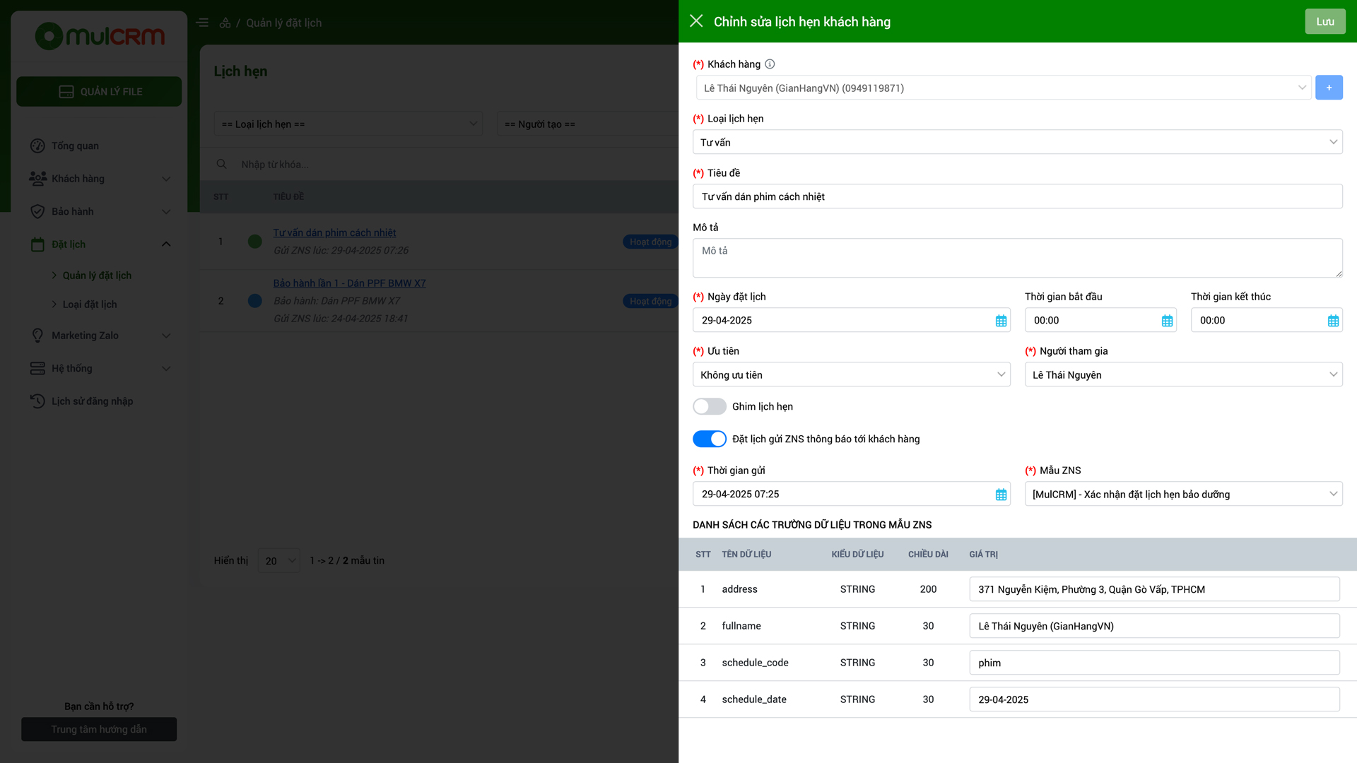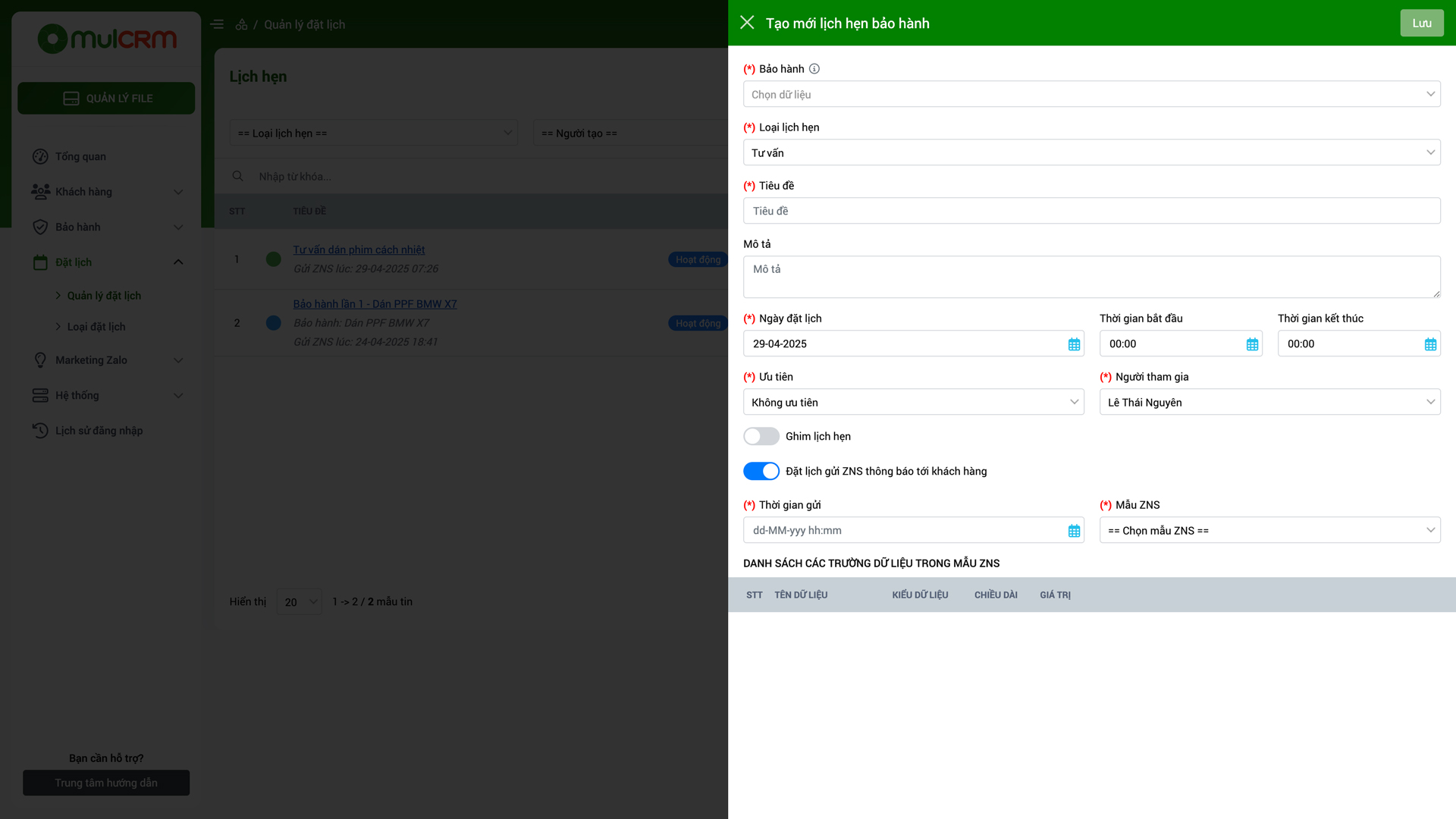 - Quản lý lịch hẹn: Hỗ trợ tạo lịch hẹn khách hàng và lịch hẹn bảo hành, với khả năng gửi thông báo tự động đến khách hàng qua Zalo ZNS.
