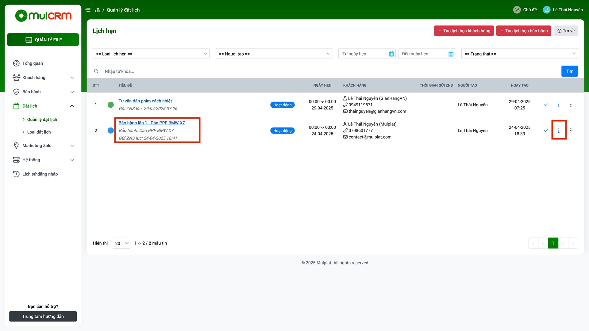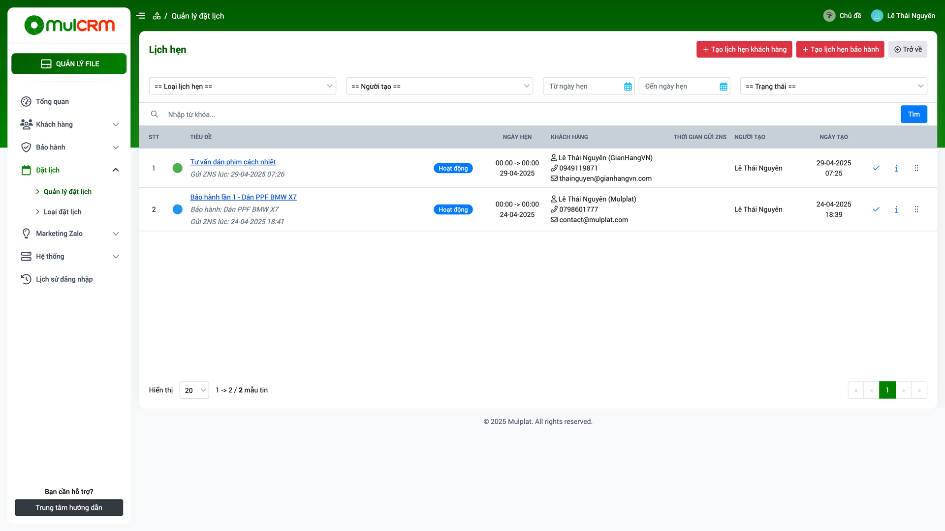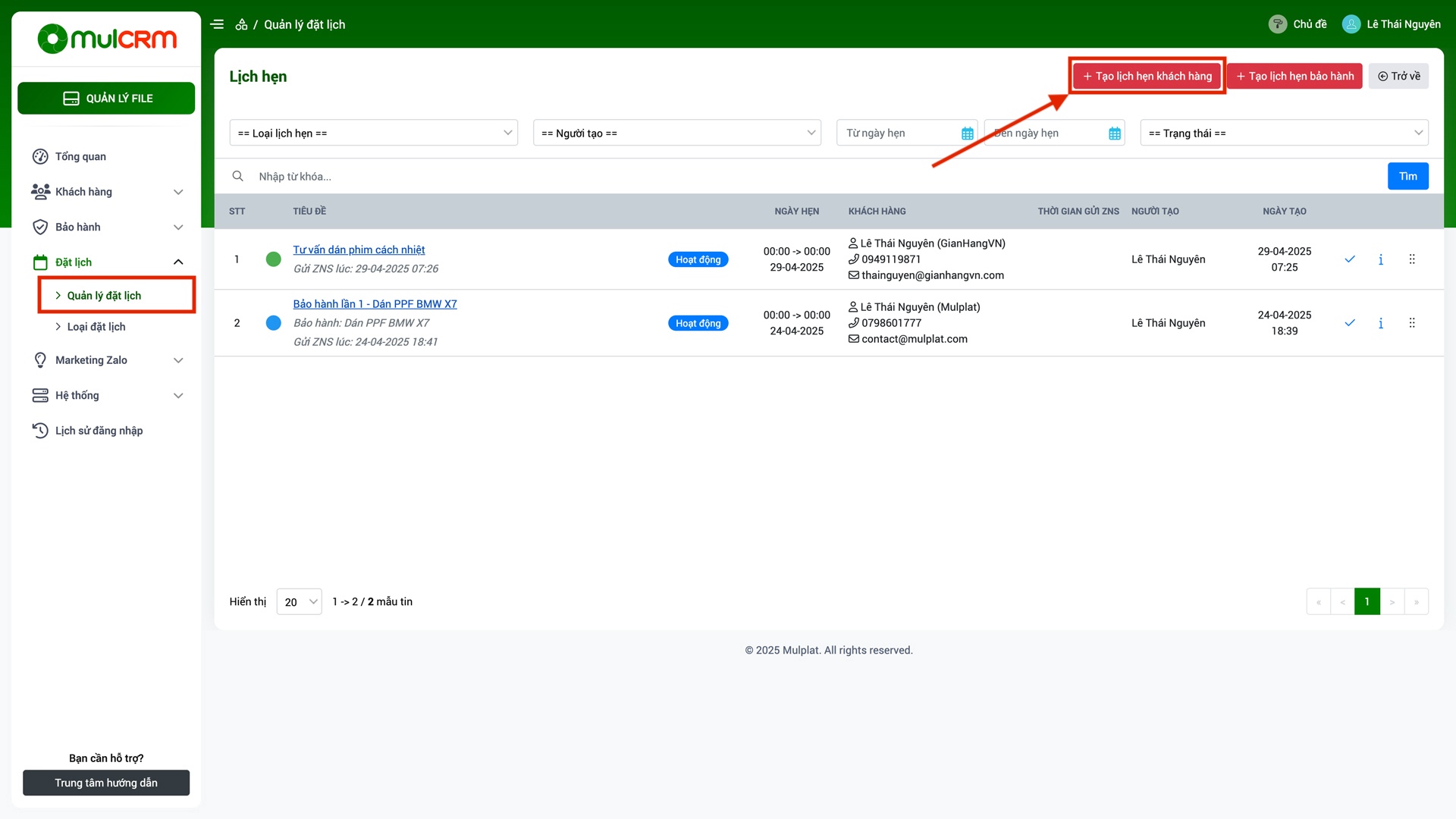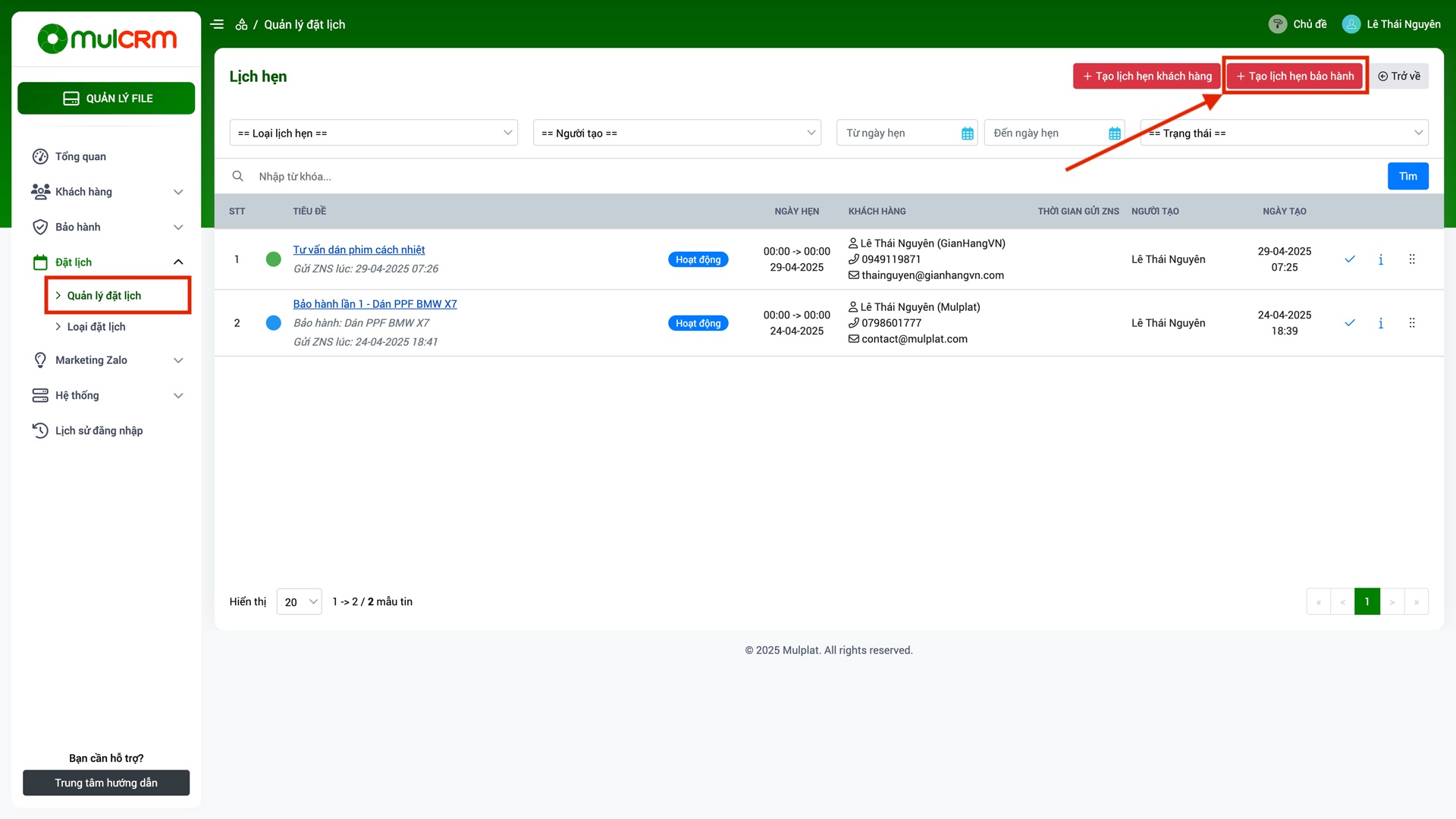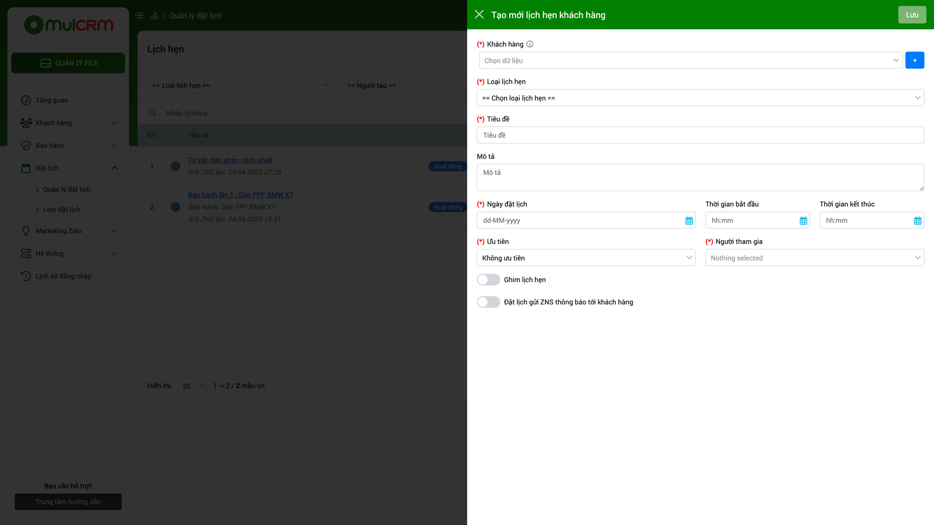 Hệ thống MulCRM mang đến giải pháp quản lý khách hàng và dịch vụ toàn diện, trong đó tính năng "Tạo lịch hẹn khách hàng" và "Tạo lịch hẹn bảo hành" đóng vai trò then chốt, giúp doanh nghiệp tối ưu hóa quy trình làm việc và nâng cao trải nghiệm khách hàng. Giúp doanh nghiệp xây dựng mối quan hệ bền vững với khách hàng và tối ưu hóa hoạt động dịch vụ một cách hiệu quả.