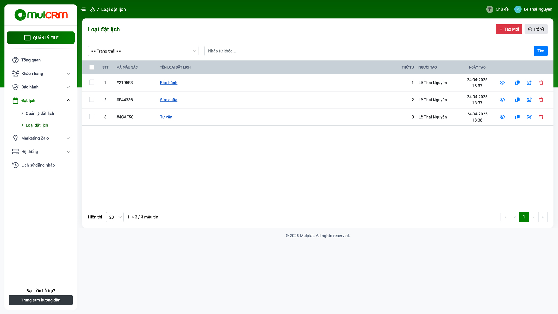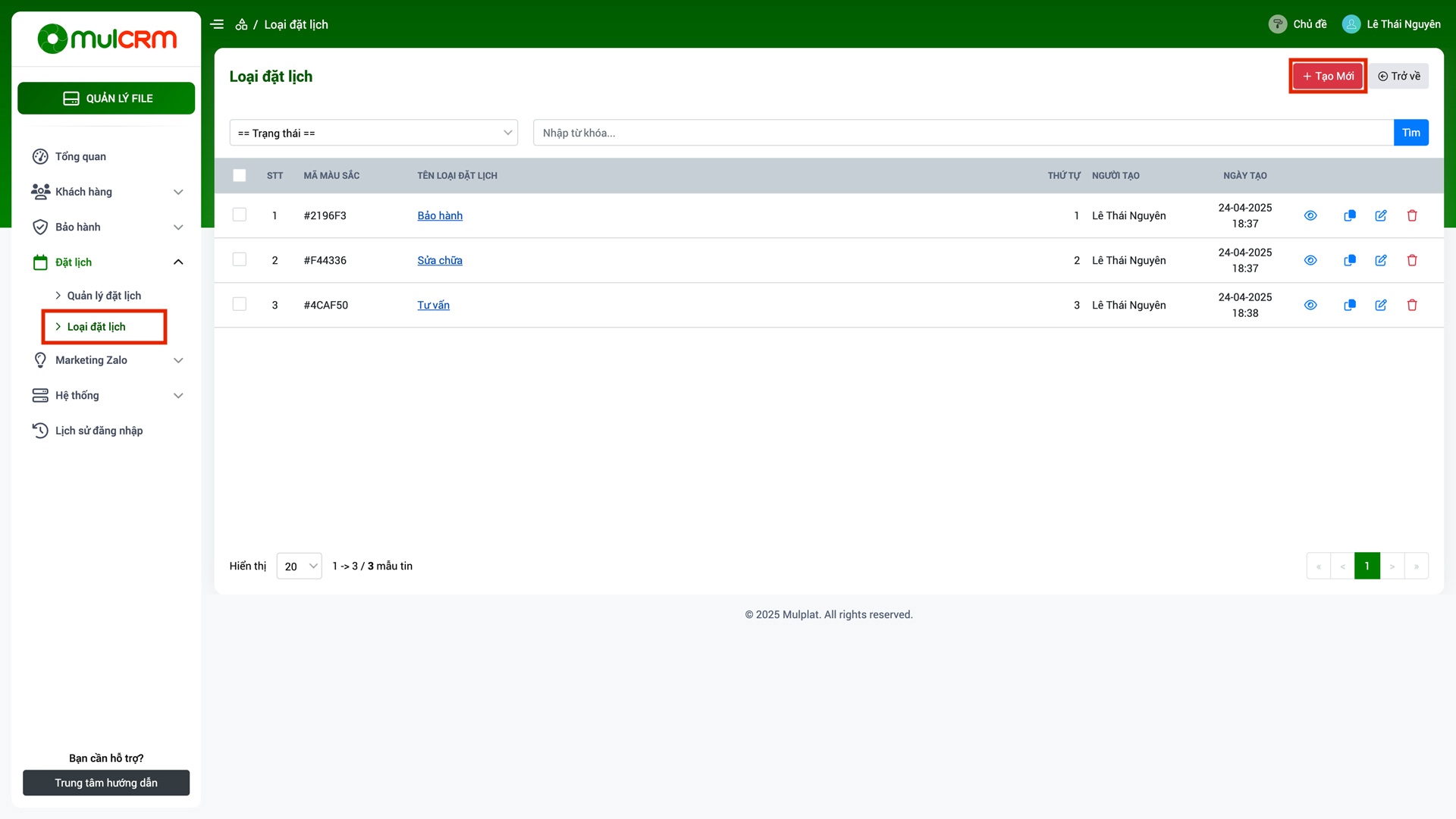 MulCRM hỗ trợ quản lý loại đặt lịch mục đích để phân chia lịch hẹn theo từng loại để dễ dàng quản lý và tạo lịch hẹn theo đúng nhu cầu.