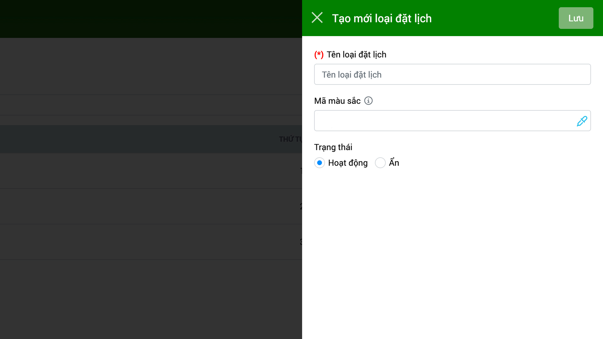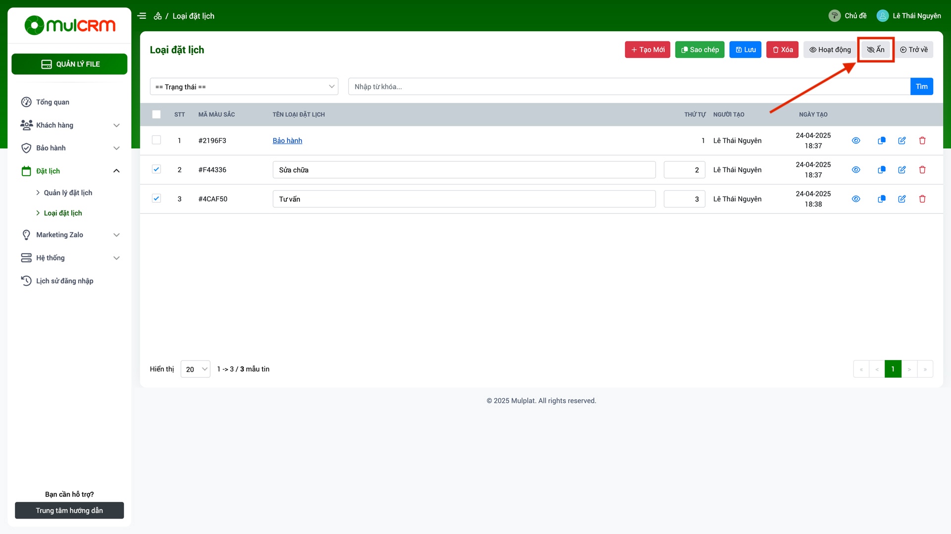 - Ẩn/Hiện: Thay đổi trạng thái ẩn hiện của loại đặt lịch trên hệ thống.