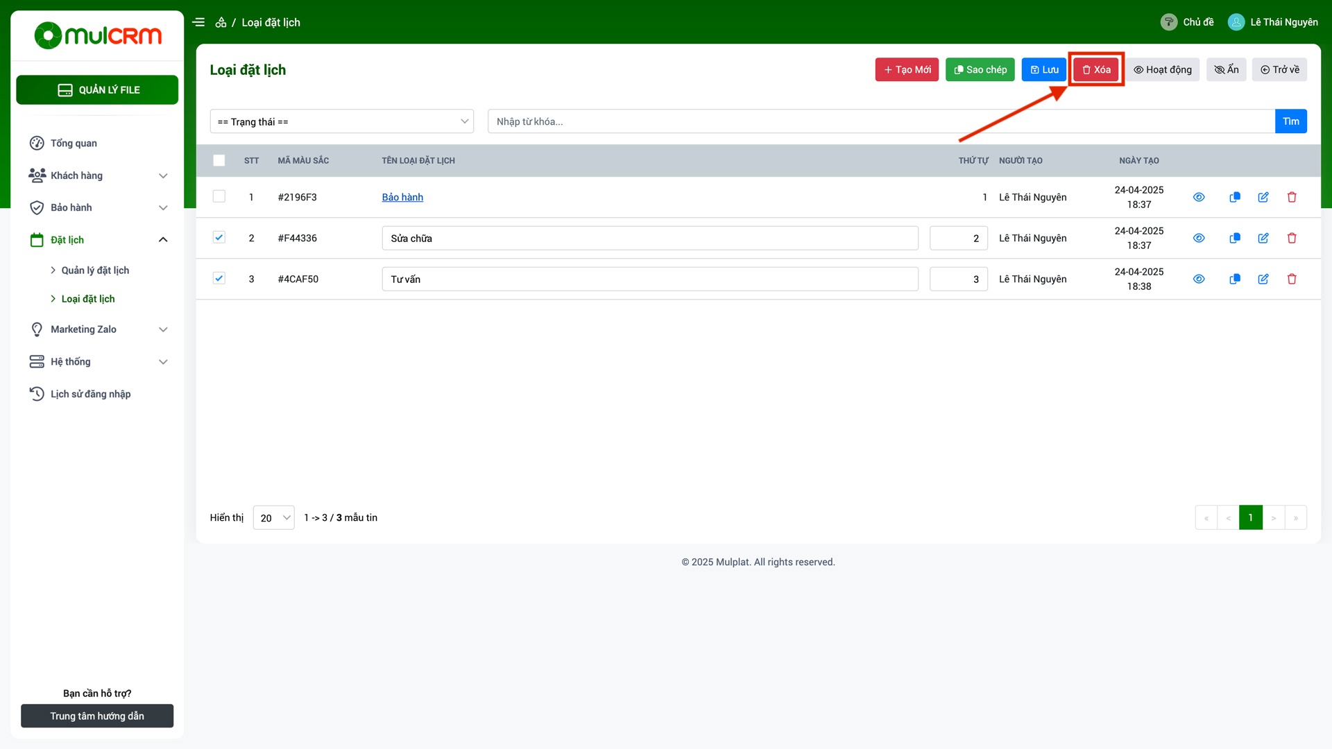 - Bước 1:Check chọn 1 hoặc nhiều dòng loại đặt lịch cần xóa.