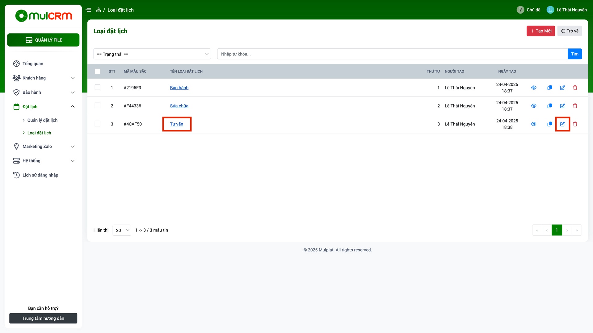 - Chỉnh sửa: Mở ra màn hình để chỉnh sửa chi tiết loại đặt lịch.