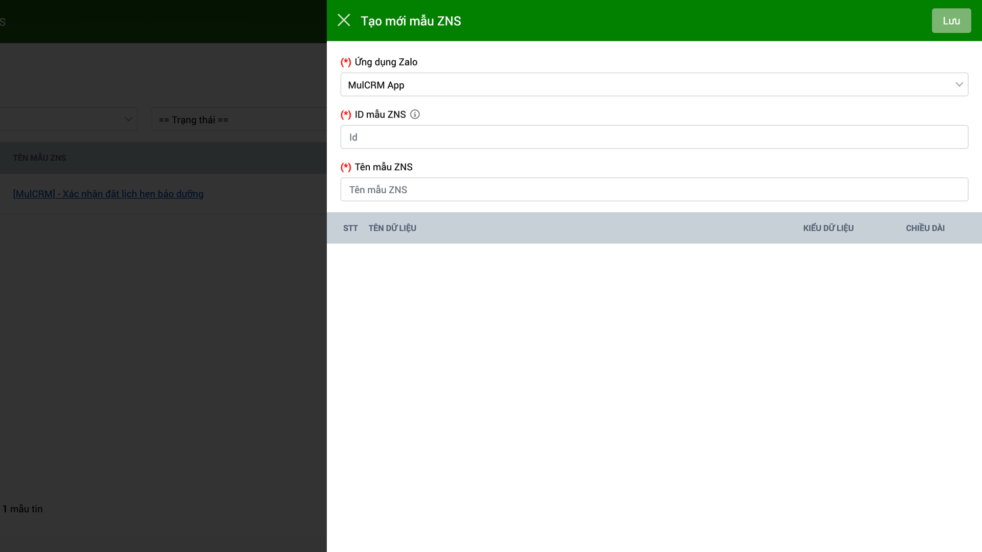 - Tên mẫu ZNS: Tên của mẫu ZNS giúp bạn quản lý các mẫu đã tạo thuận tiện hơn. - Bước 4: Bấm "Lưu".
