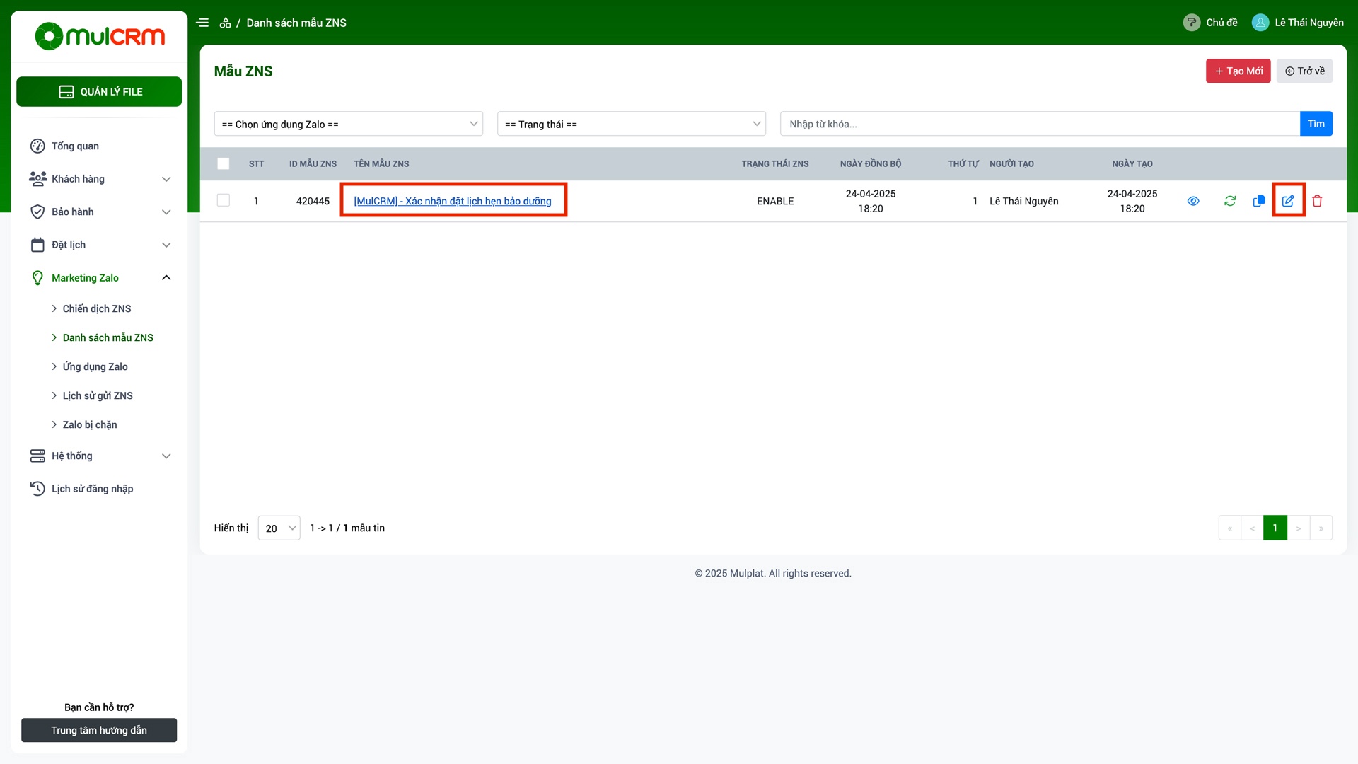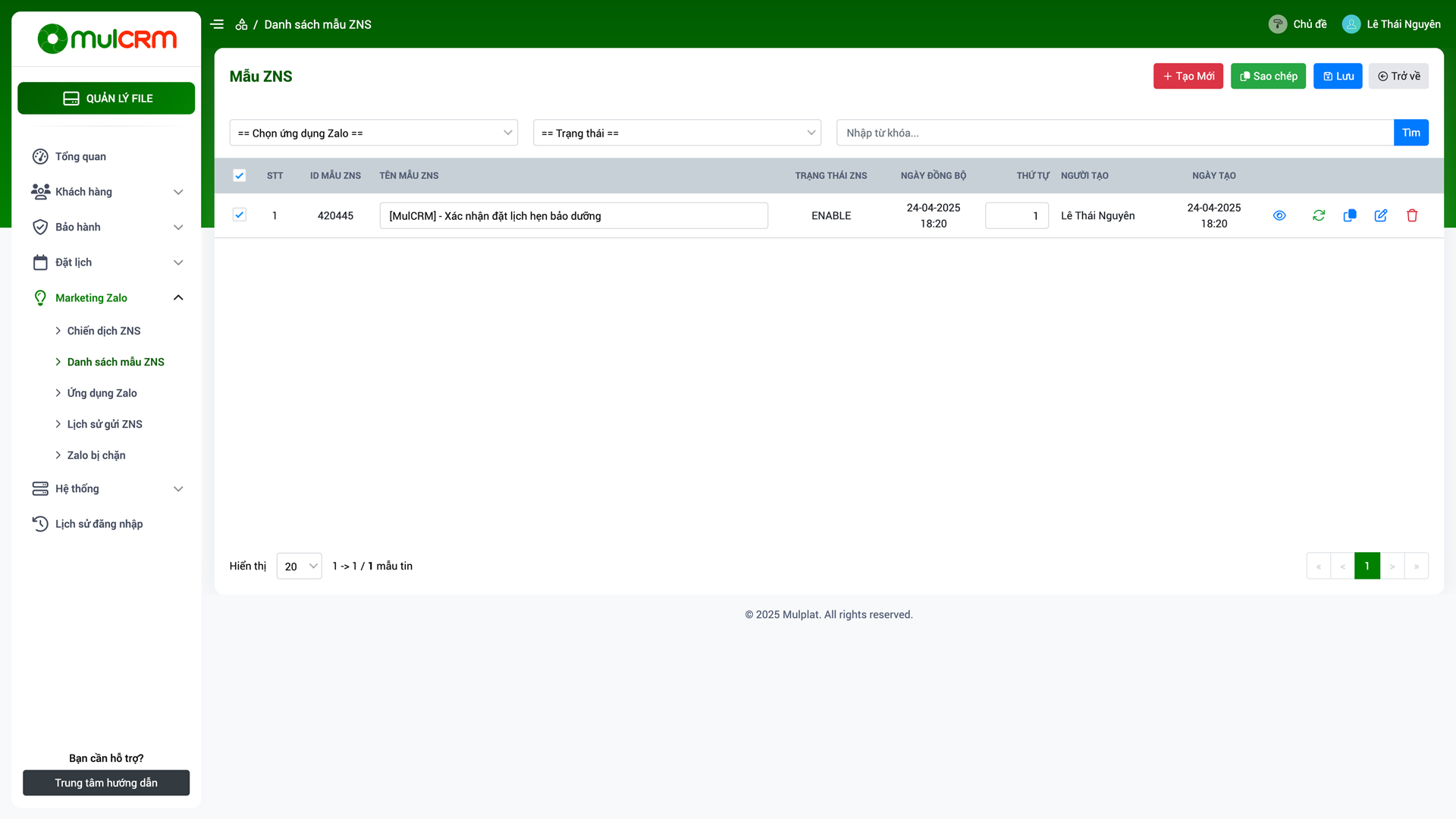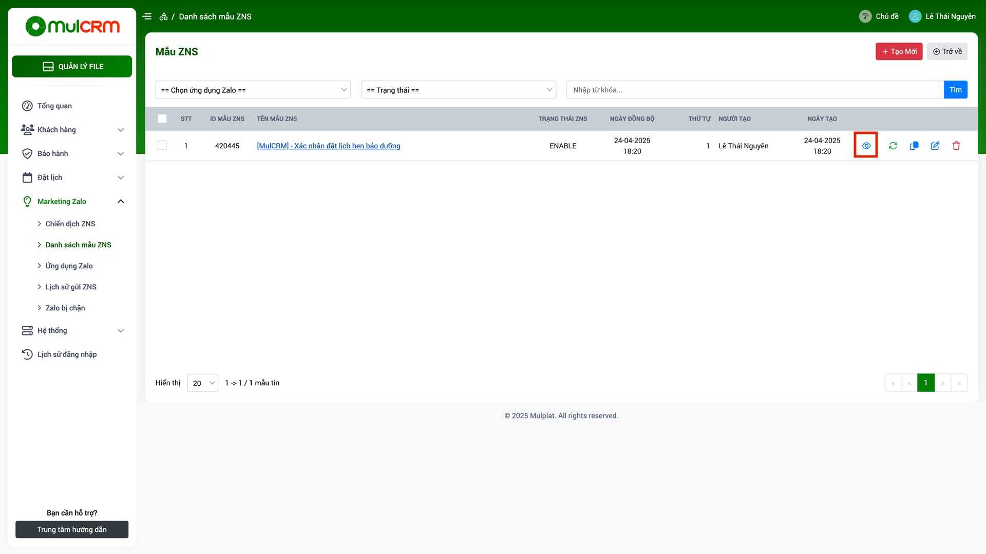 - Làm mới dữ liệu: Để cập nhật dữ liệu mới nhất của ZNS từ hệ thống MulCRM