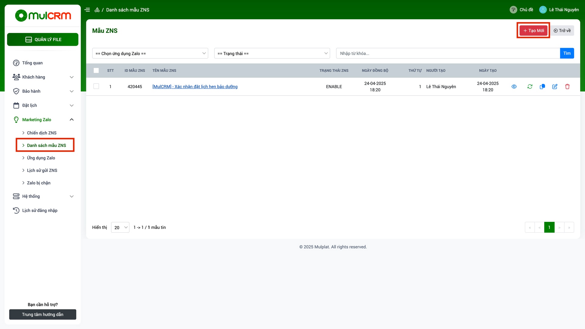 - Bước 2:Trên hệ thống MulCRM, truy cập vào trang Admin, chọn mục "Marketing Zalo" => "Danh sách mẫu ZNS" => Nhấn nút "Tạo mới".
