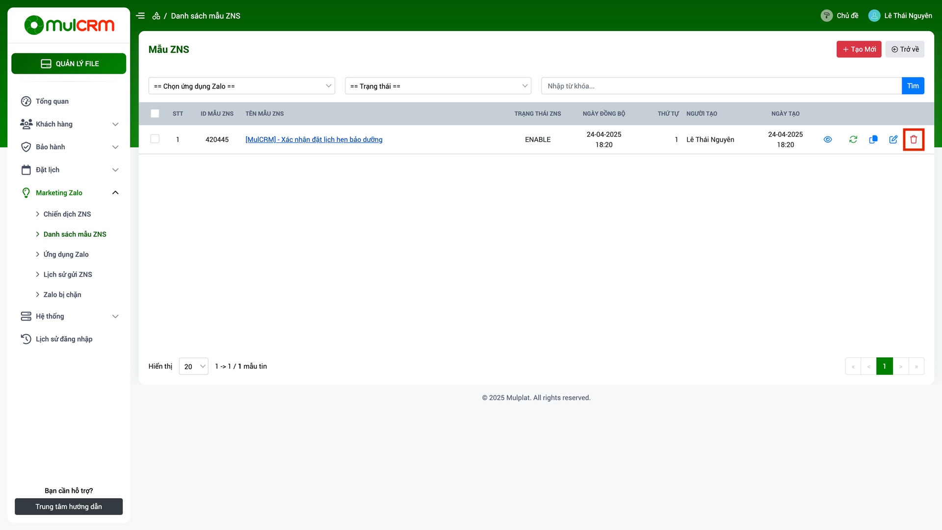 Trên hệ thống MulCRM, truy cập vào trang Admin, chọn mục "Marketing Zalo" => "Danh sách mẫu ZNS" - Bước 2:Tìm đến dòng mẫu ZNS cần xóa và nhấn nút "Xóa" ở cuối (Nút Xóa màu đỏ hàng nút phía trên) => Nhấn nút "Yes" để xác nhận xóa hàng loạt.