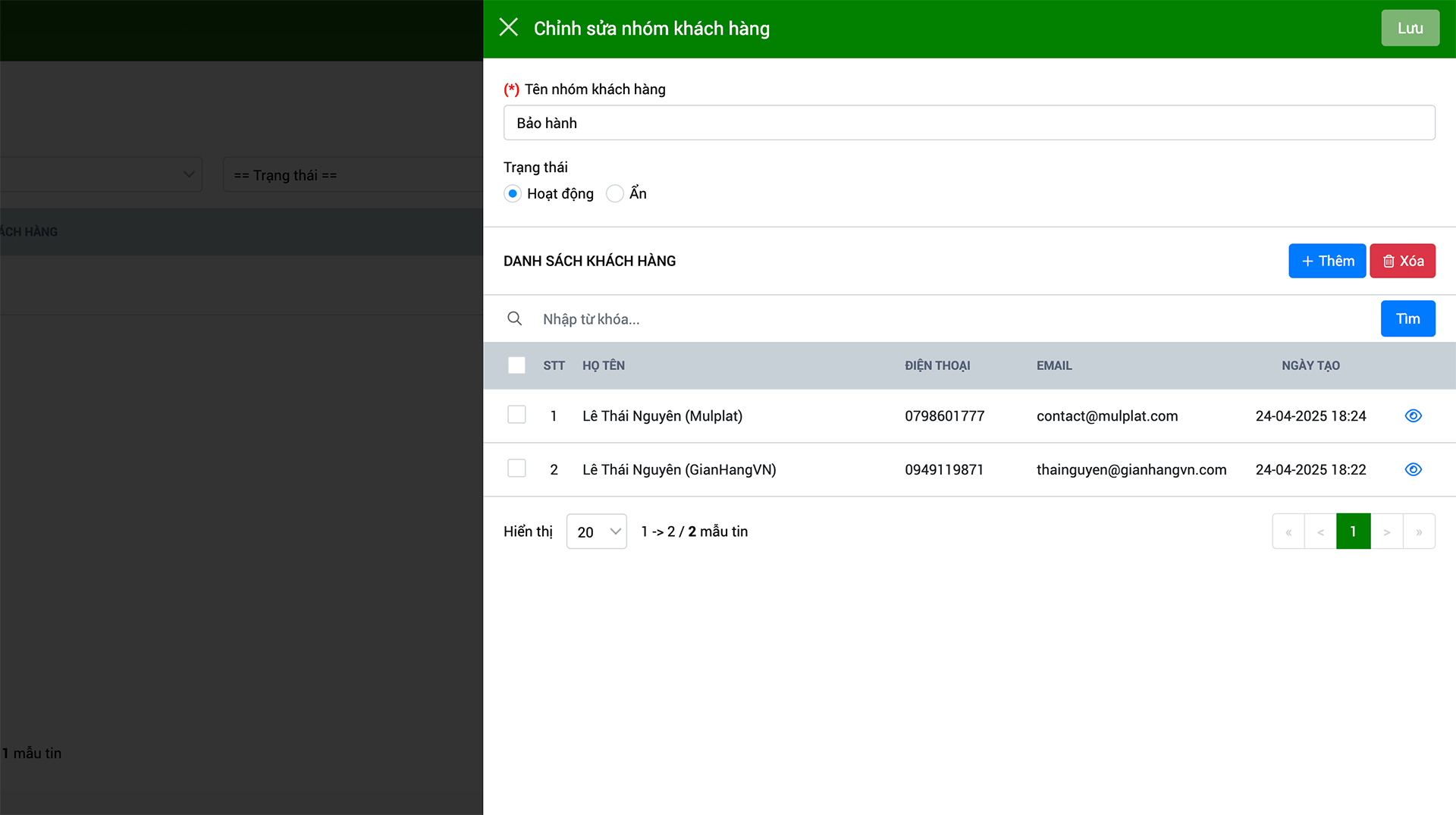 - Bước 2: Nhập tên nhóm khách hàng, Thay đổi trạng thái, Thêm/xóa khách hàng theo nhu cầu.