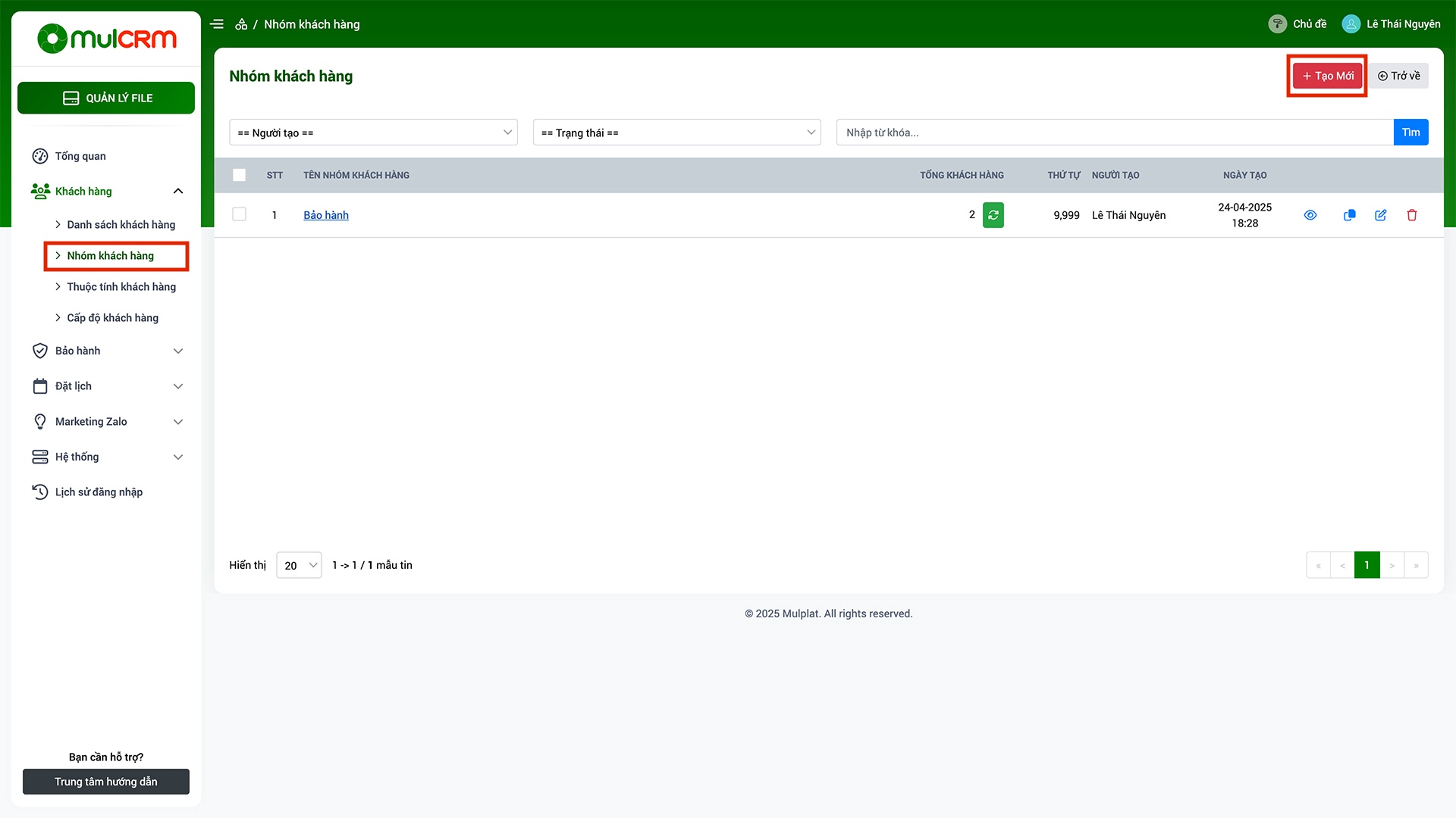 - Bước 1: Truy cập vào trang Admin, chọn mục Khách hàng => Nhóm khách hàng => Nhấn nút Tạo mới.