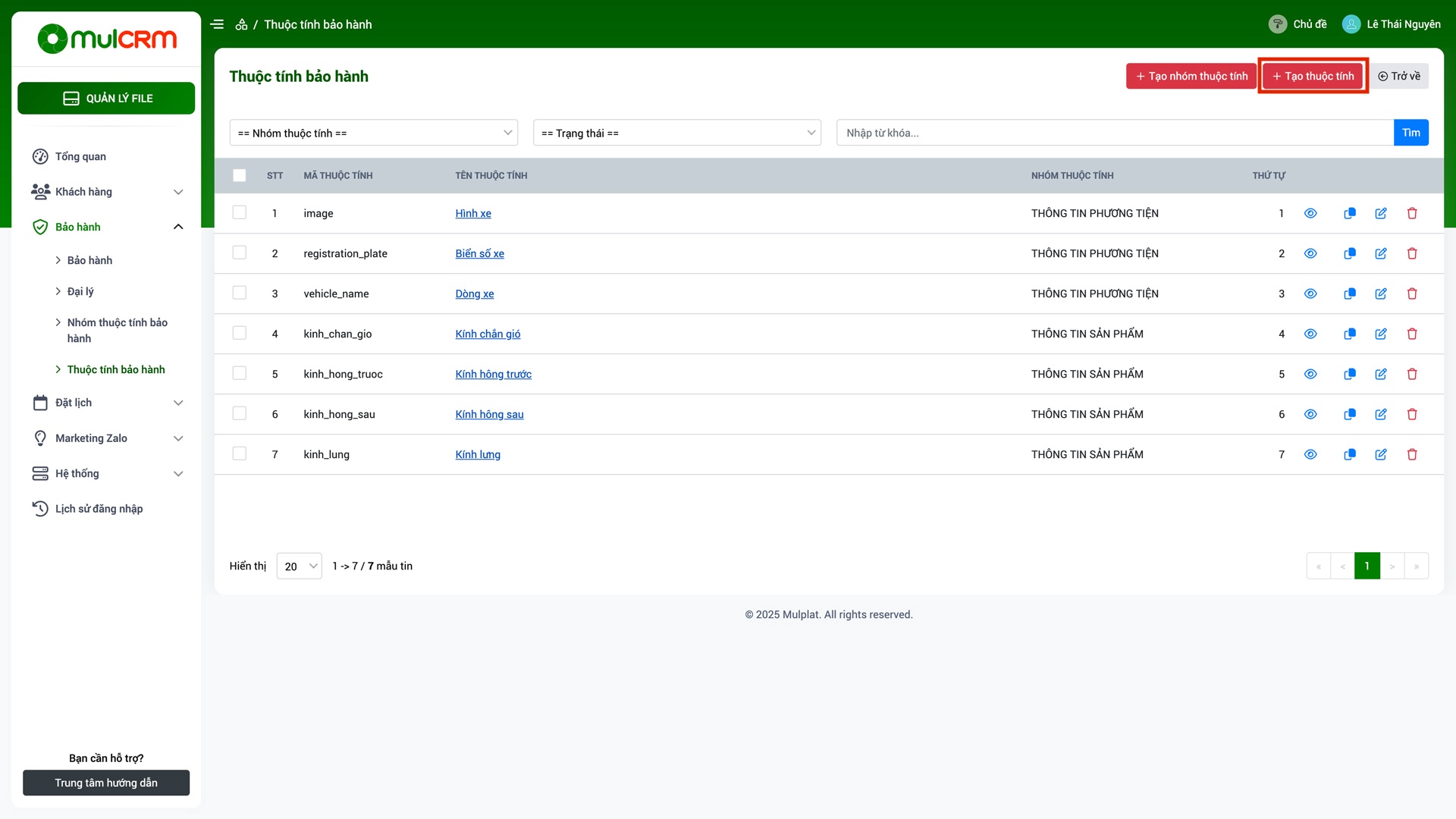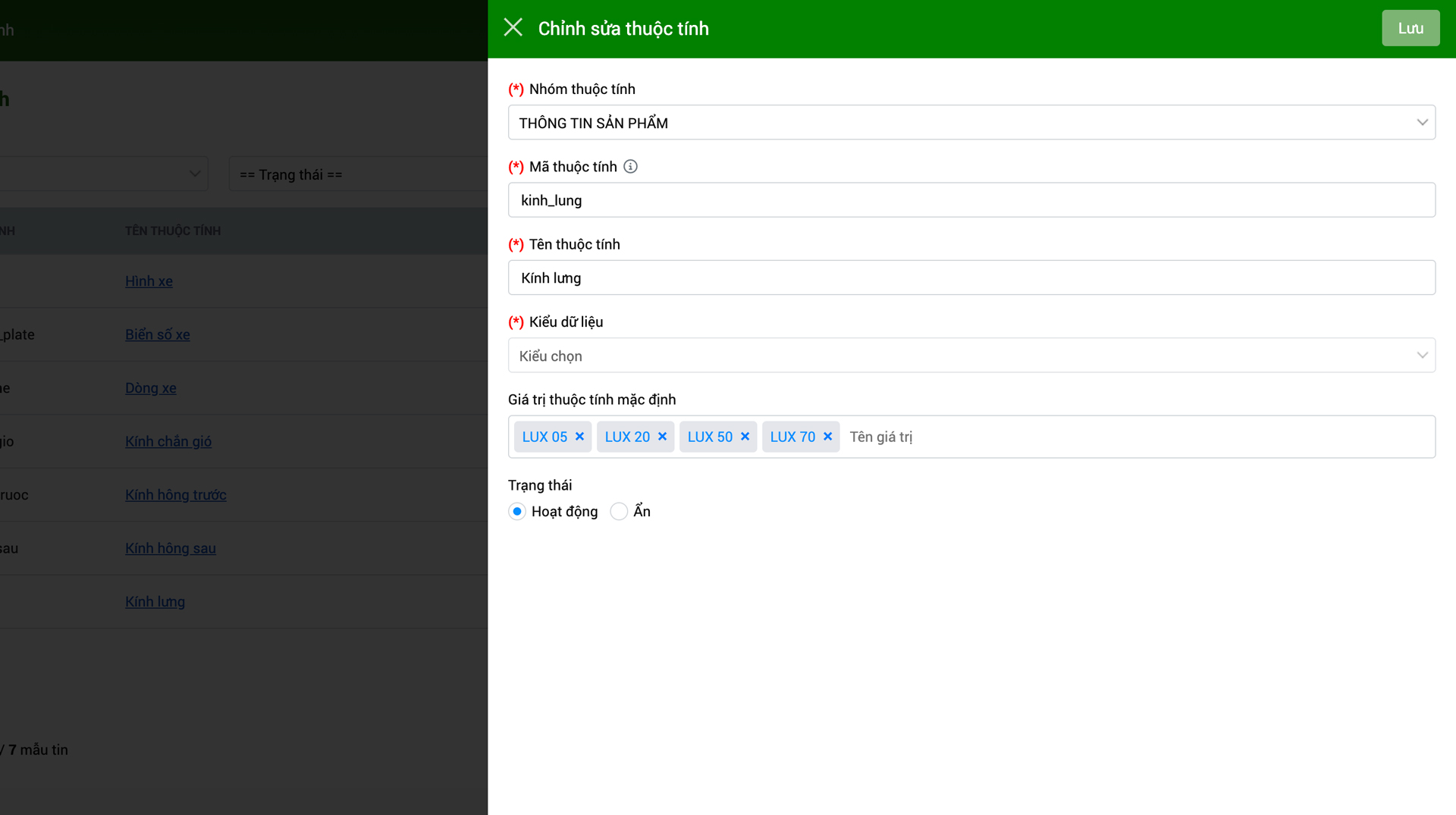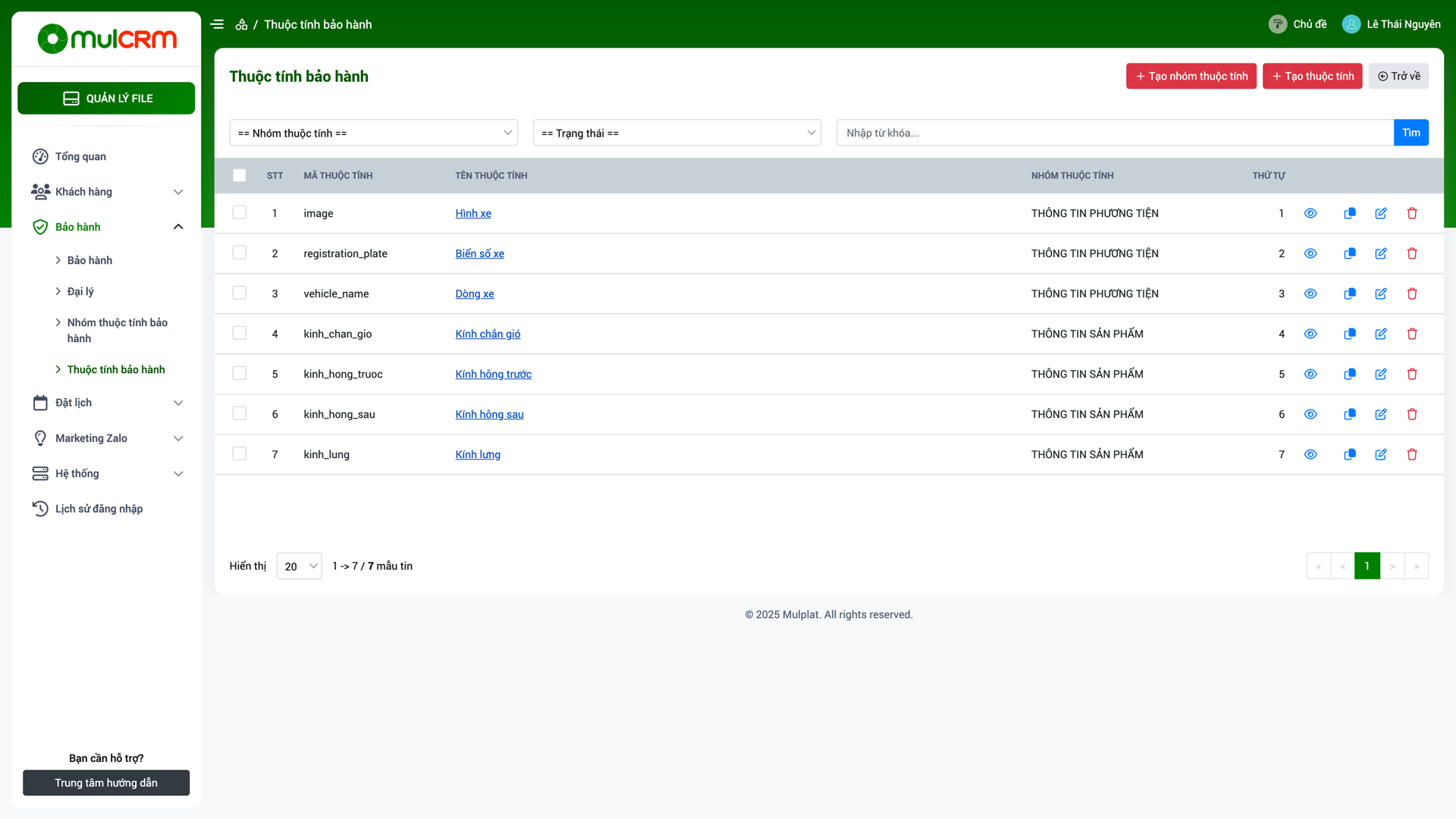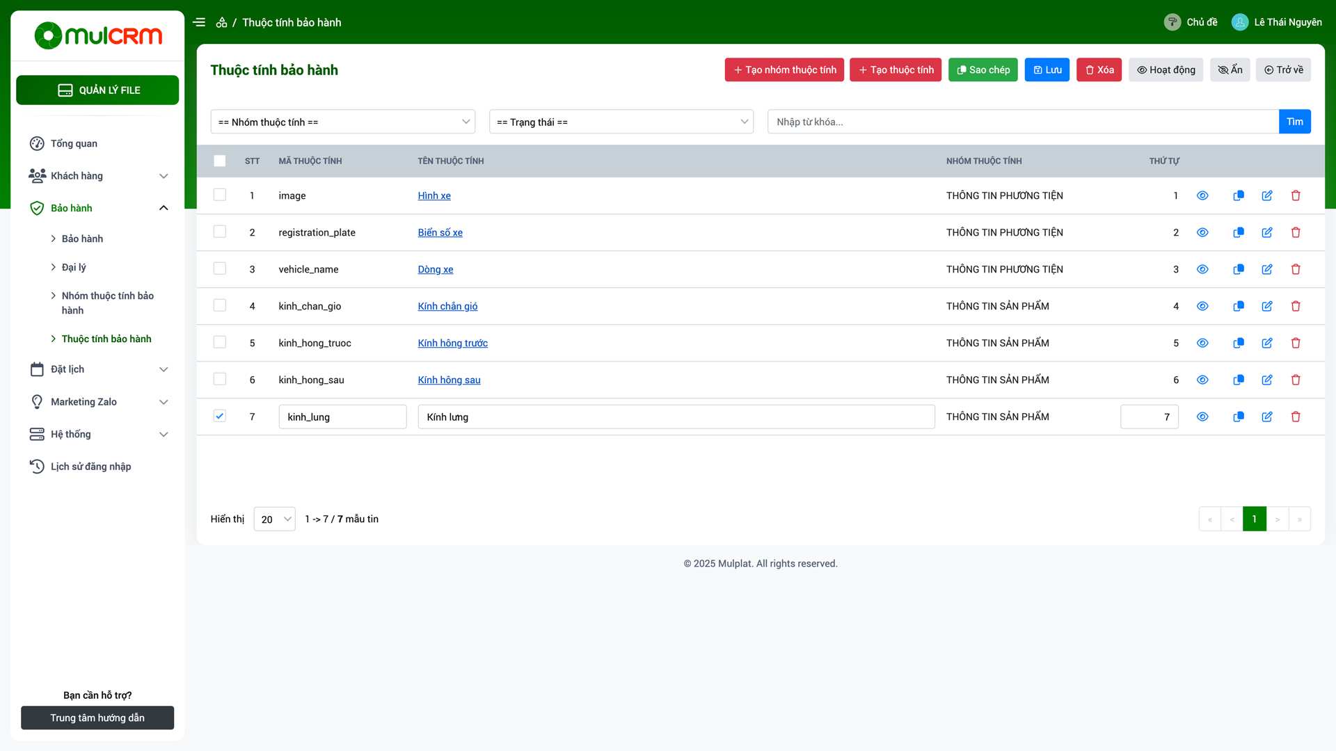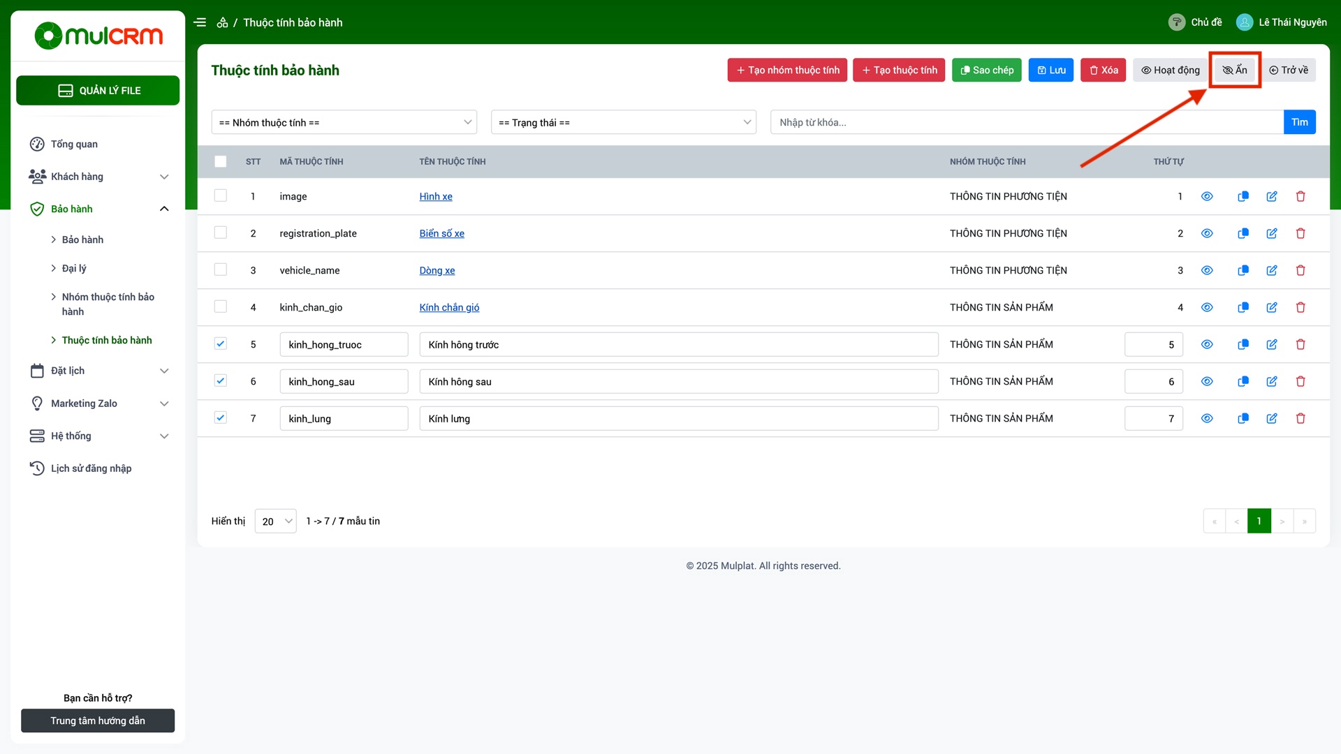 - Ẩn/Hiện: Thay đổi trạng thái ẩn hiện của thuộc tính bảo hành trên hệ thống.