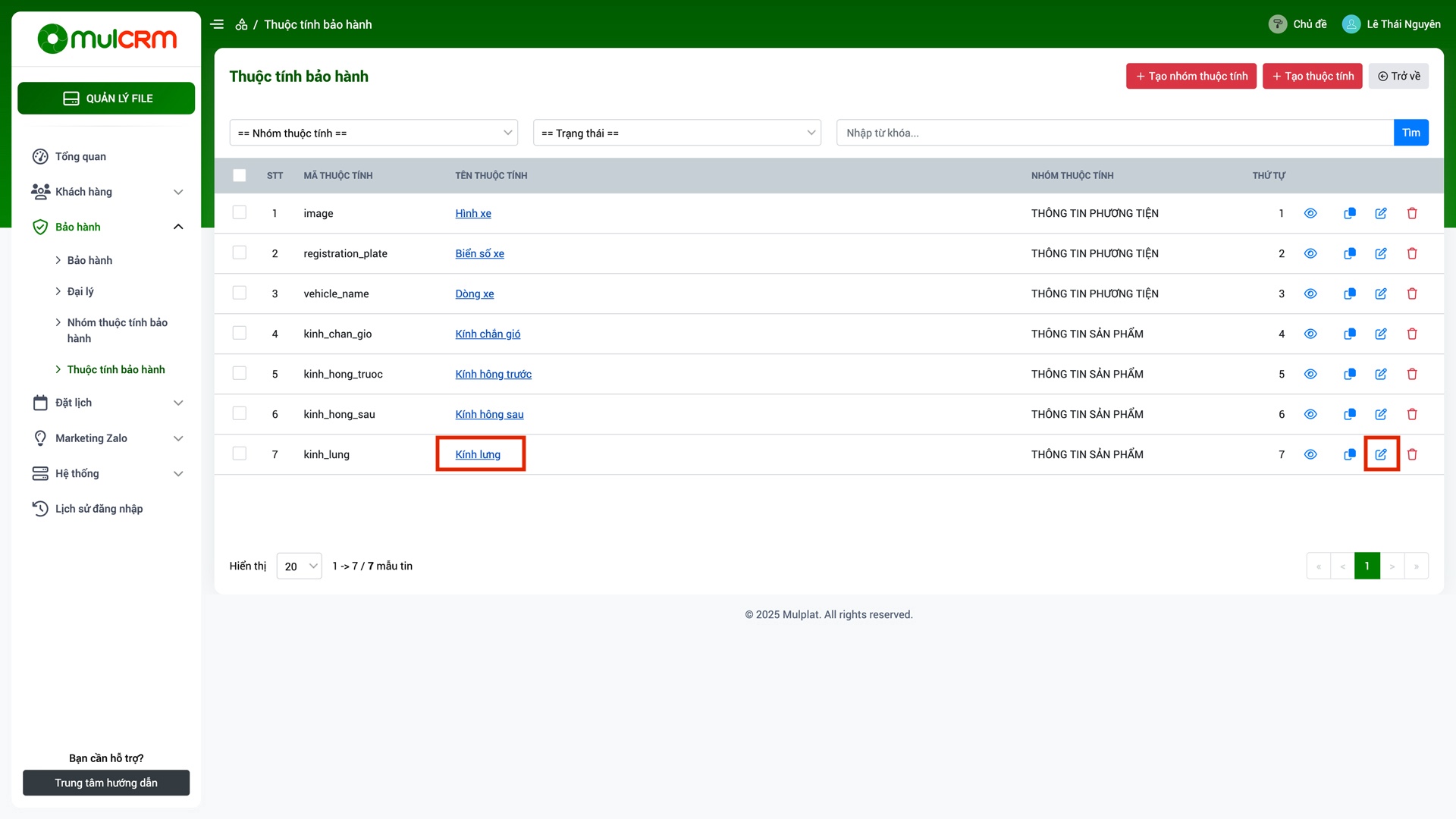 - Chỉnh sửa: Mở ra màn hình để chỉnh sửa chi tiết thuộc tính bảo hành.