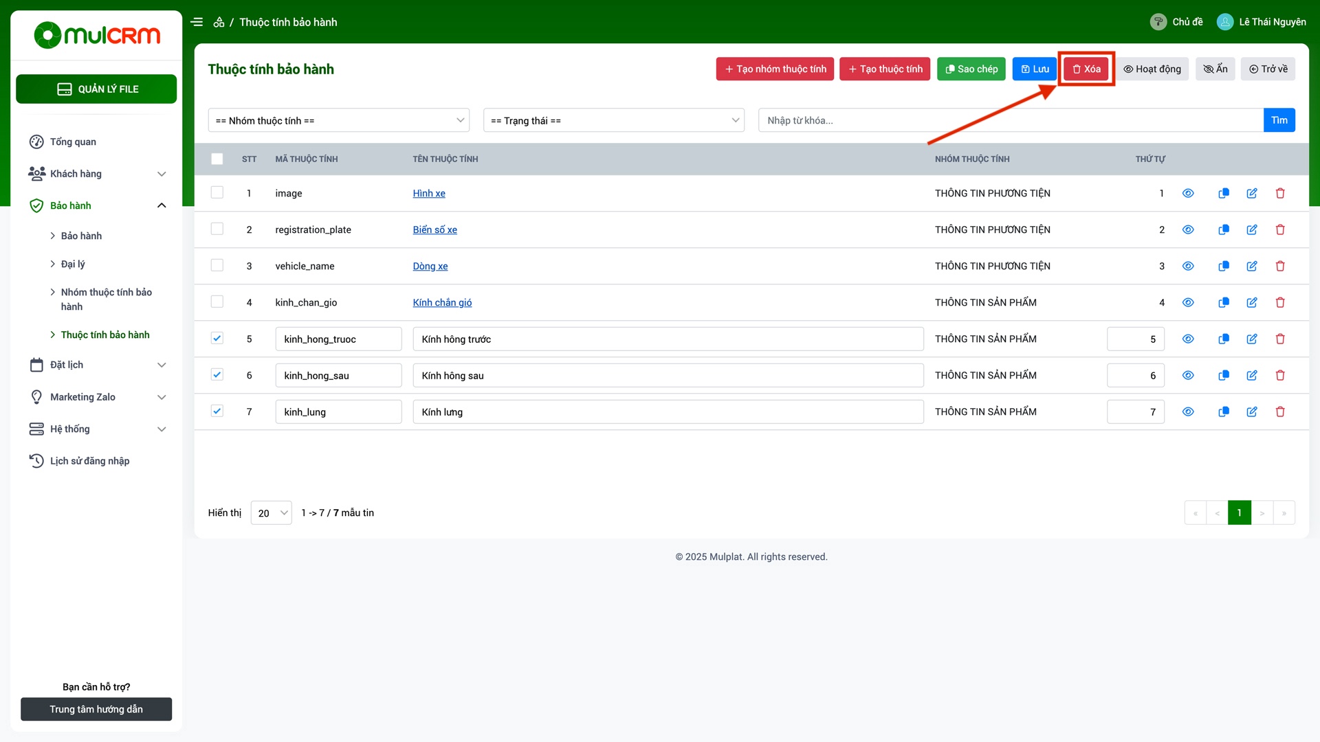 - Bước 1:Check chọn 1 hoặc nhiều dòng thuộc tính bảo hành cần xóa.