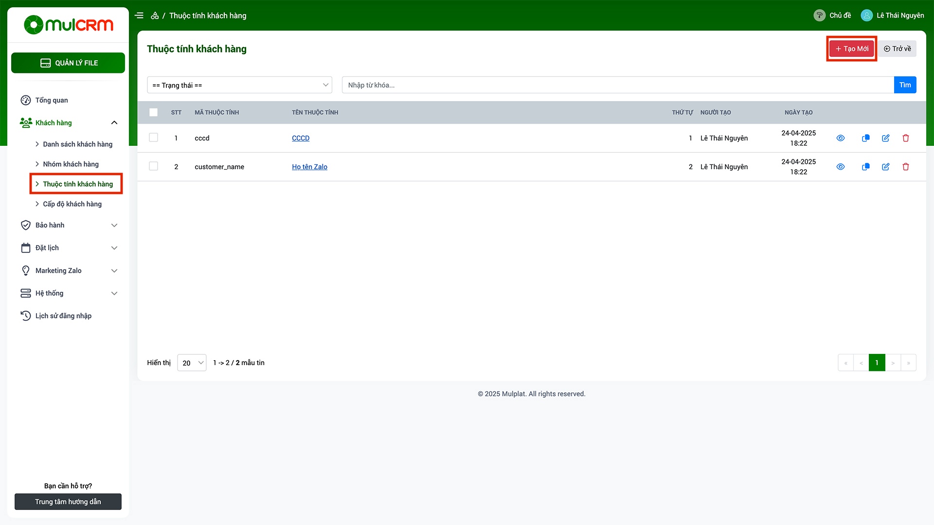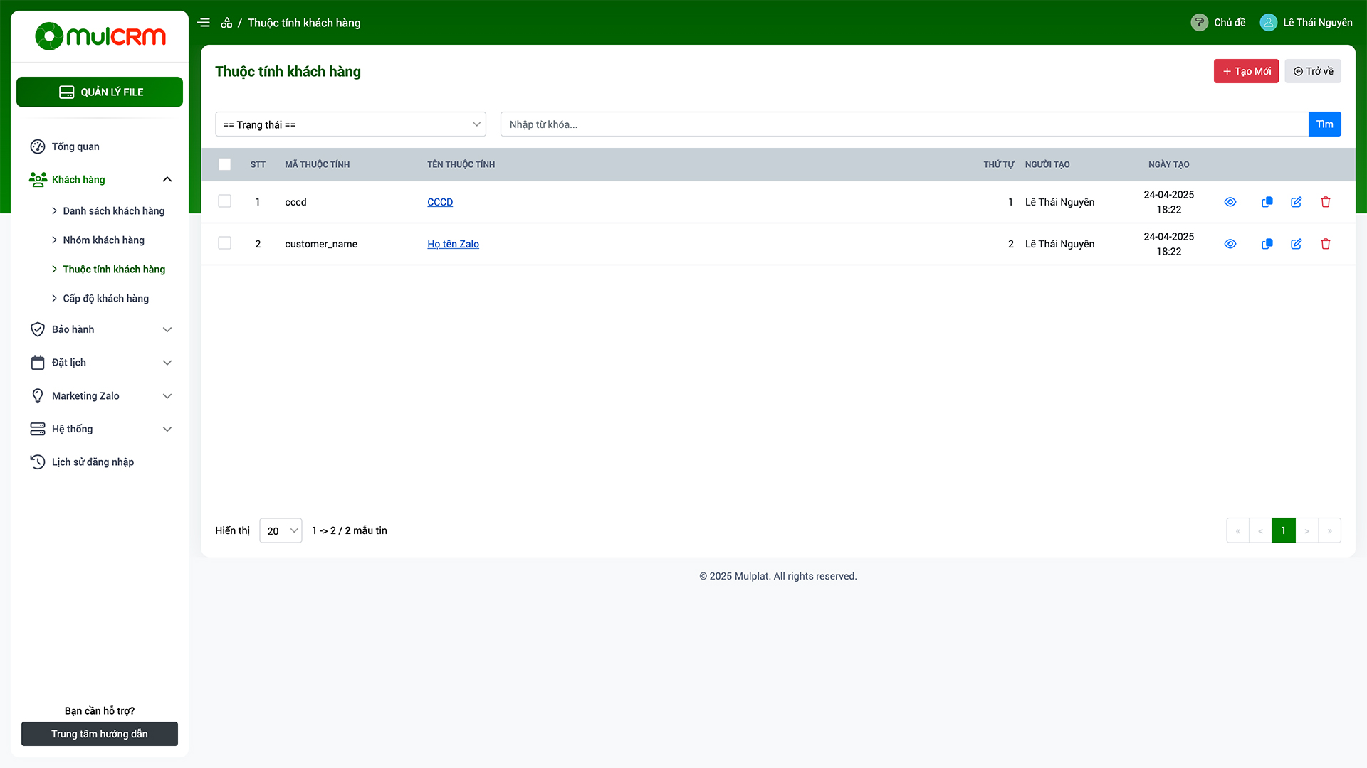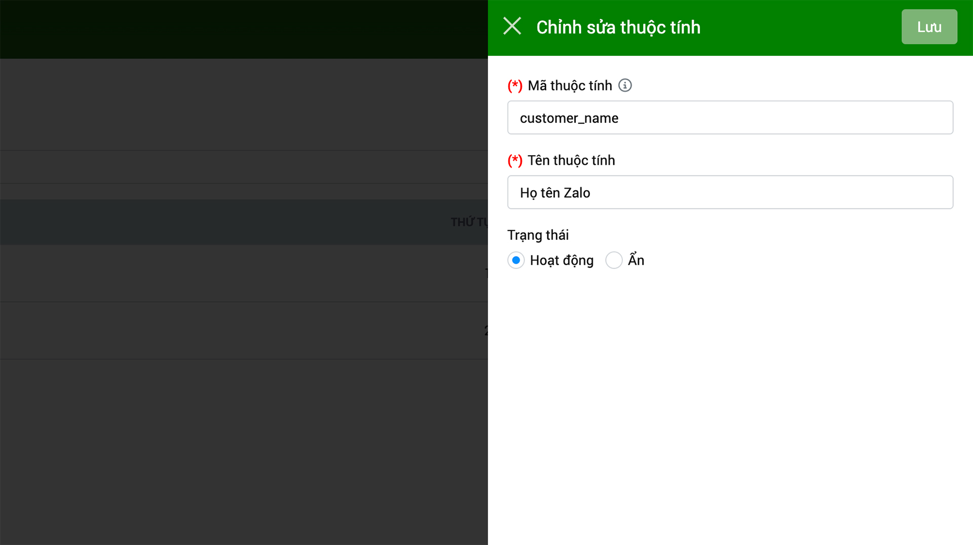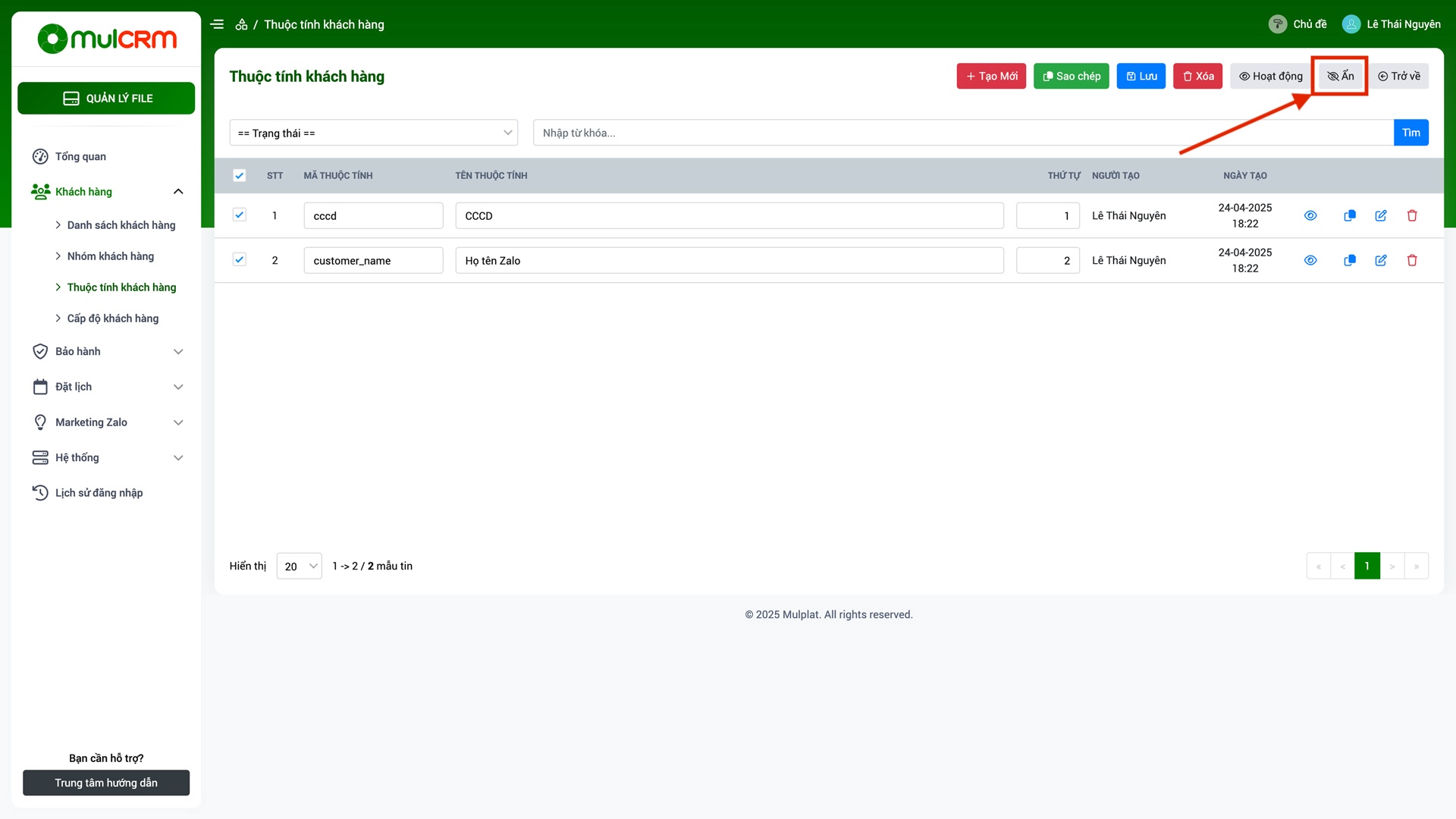 - Ẩn/Hiện: Thay đổi trạng thái ẩn hiện của thuộc tính khách hàng trên hệ thống.