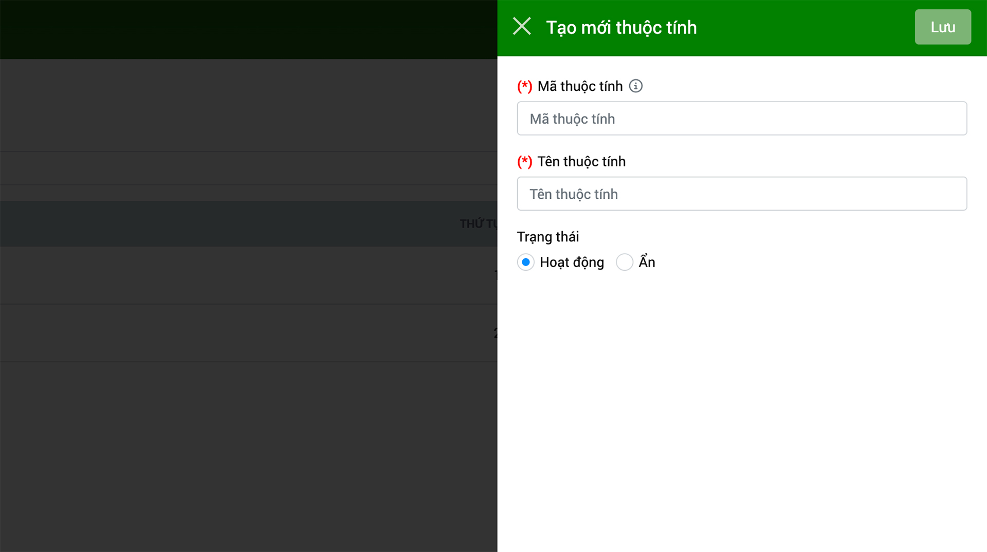 - Bước 2: Nhập các giá trị "Mã thuộc tính", "Tên thuộc tính" và chọn "Trạng thái".