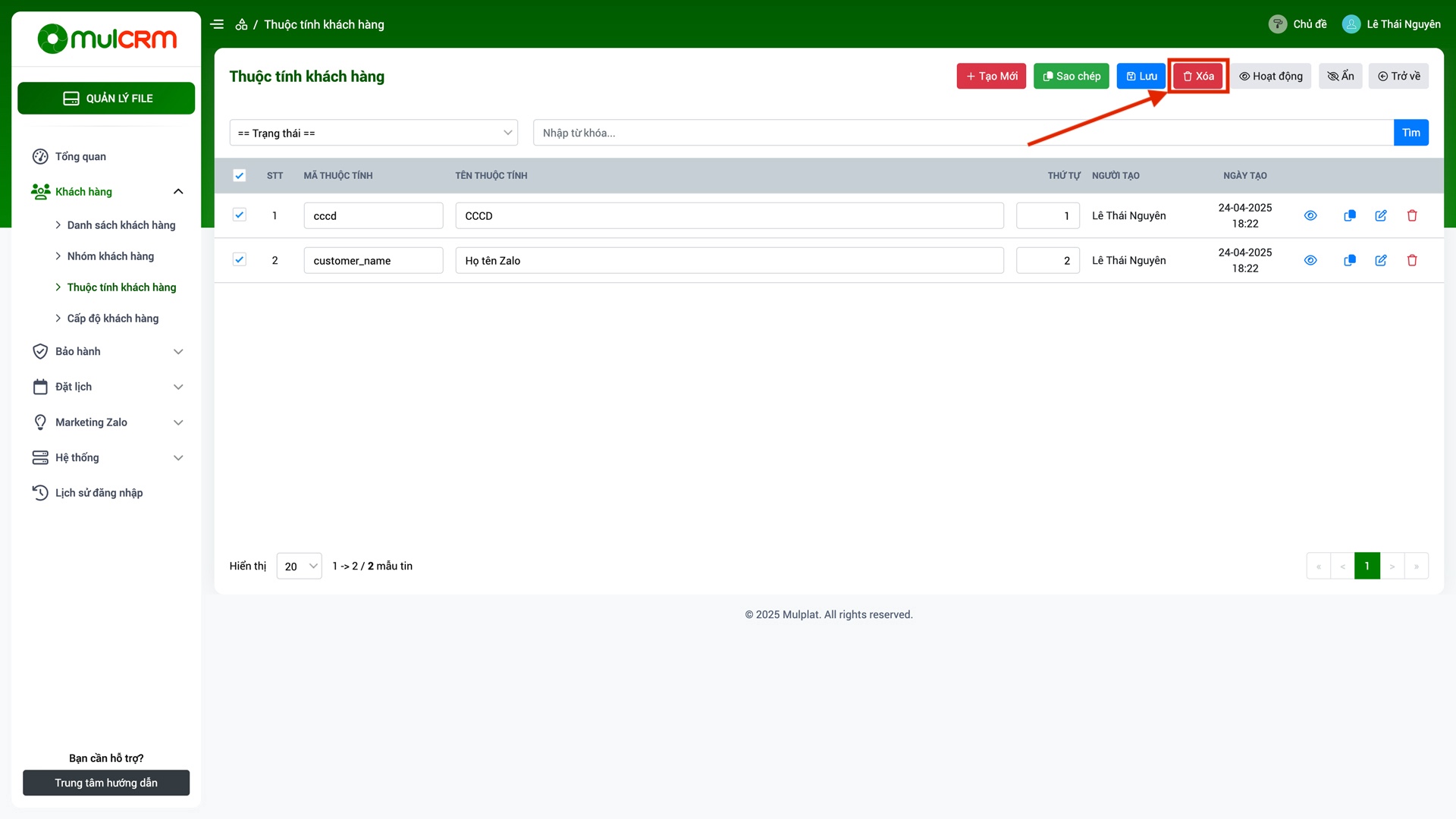 - Bước 1:Check chọn 1 hoặc nhiều thuộc tính khách hàng cần xóa.