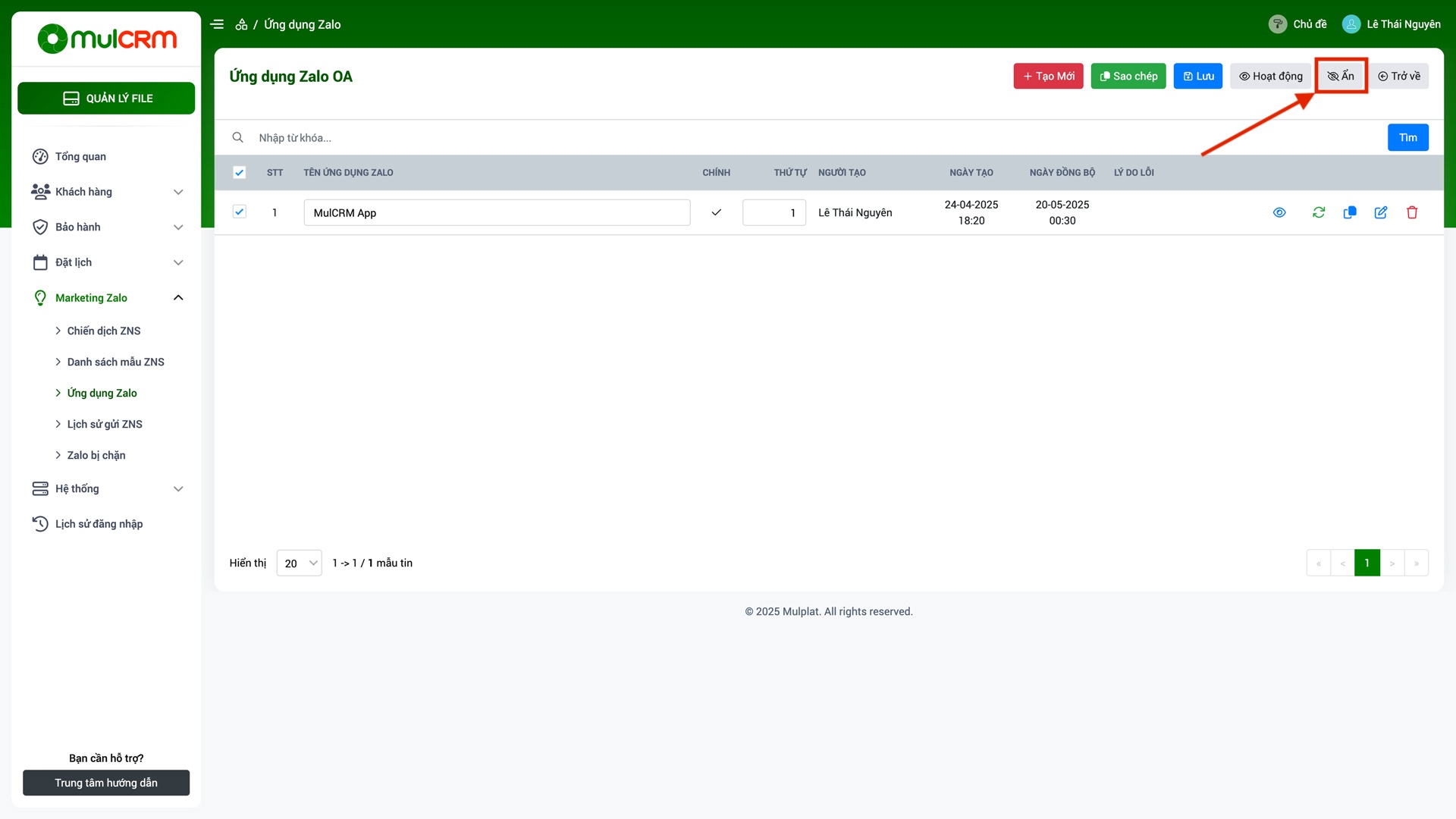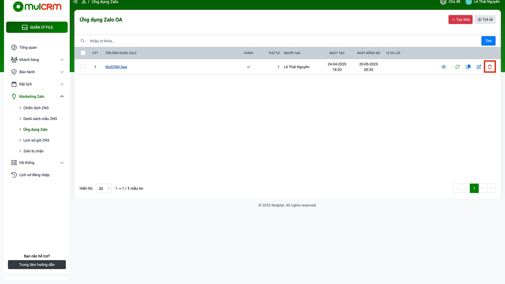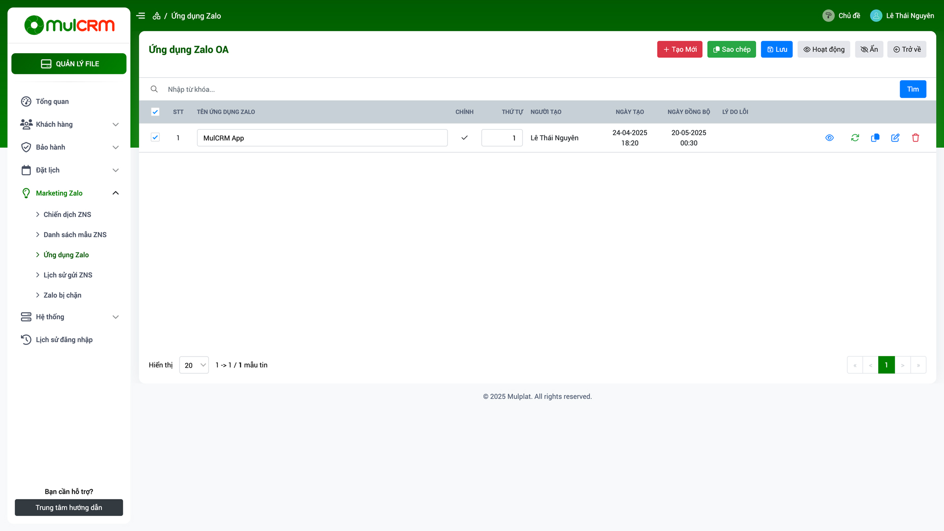 - Làm mới danh sách: Cập nhật thông tin ứng dụng Zalo mới nhất từ hệ thống MulCRM