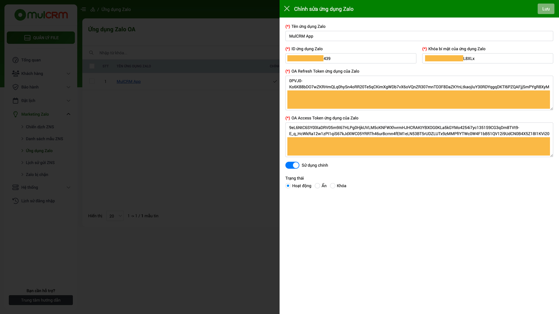 Lưu ý: Các giá trị Khóa bí mật, OA Refresh Token và OA Access Token không được chia sẻ cho bất cứ ai. Khi nhập vào hệ thống MulCRM nên copy chính xác để tránh phát sinh lỗi.